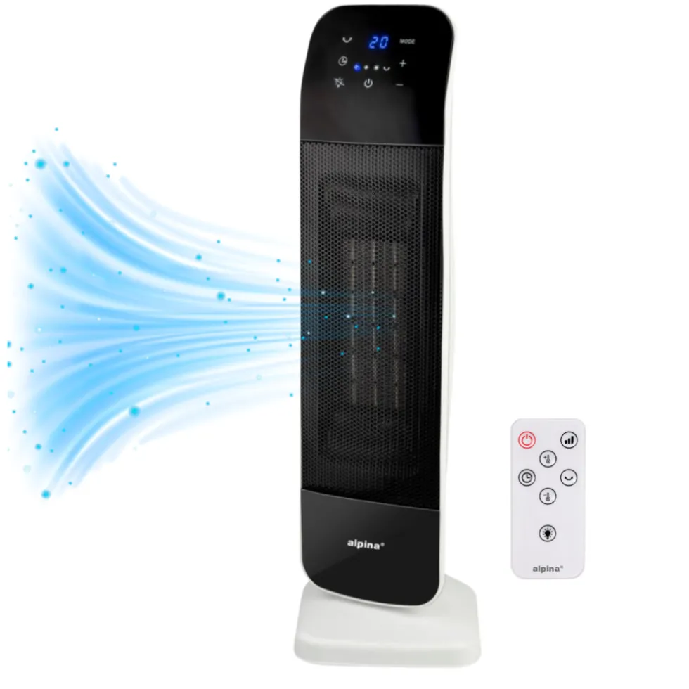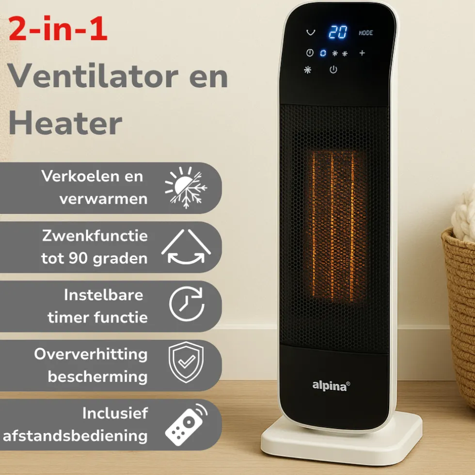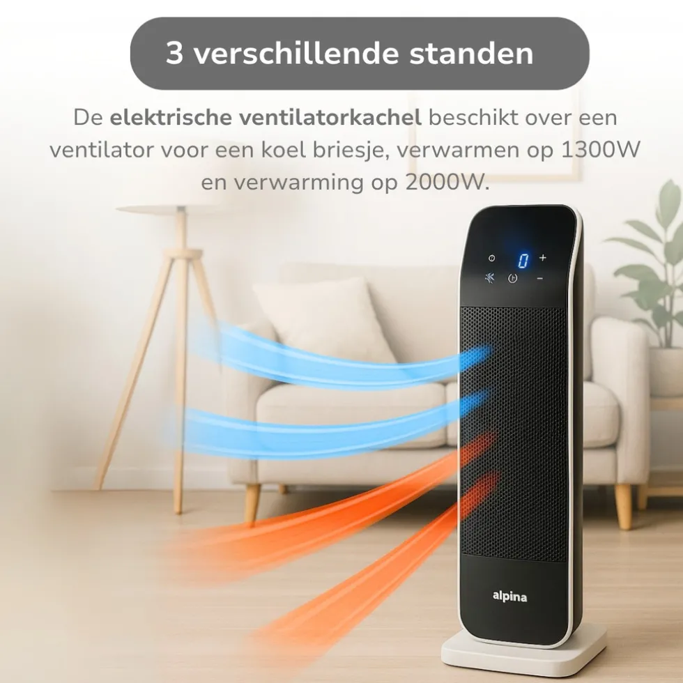 In de eerste stand verspreidt het apparaat alleen lucht en werkt dus als ventilator die verkoeling geeft op warme dagen. Stand 2 en 3 geven verwarming af, waarbij je de temperatuur kan instellen tussen de 15 en 35 graden Celsius.Keramische verwarmingDeze ventilatorkachel heeft een keramisch element dat stralingswarmte afgeeft. Keramische kachels zijn relatief energiezuinig en ook veiliger dan kachels die op andere wijze verwarmen. Een keramisch element wordt namelijk veel minder heet, terwijl de kachel wel efficiënt warmte afgeeft en een ruimte snel en gelijkmatig opwarmt. Deze lagere temperatuur zorgt ook dat je geen last hebt van een verbrandingsgeur en dat de kachel geen negatief effect heeft op de luchtkwaliteit in huis. Dat is erg prettig voor mensen met gevoelige luchtwegen.Specificaties alpina elektrische verwarming en ventilator KPT-2402D