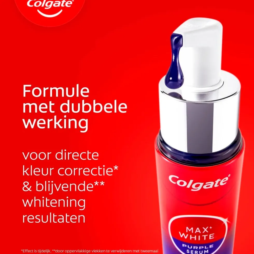 Het Colgate Max White Purple Serum is jouw whitening booster voor na het poetsen. Het corrigeert de kleur direct* en maakt je glimlach witter vanaf het eerste gebruik!