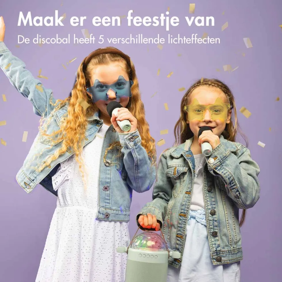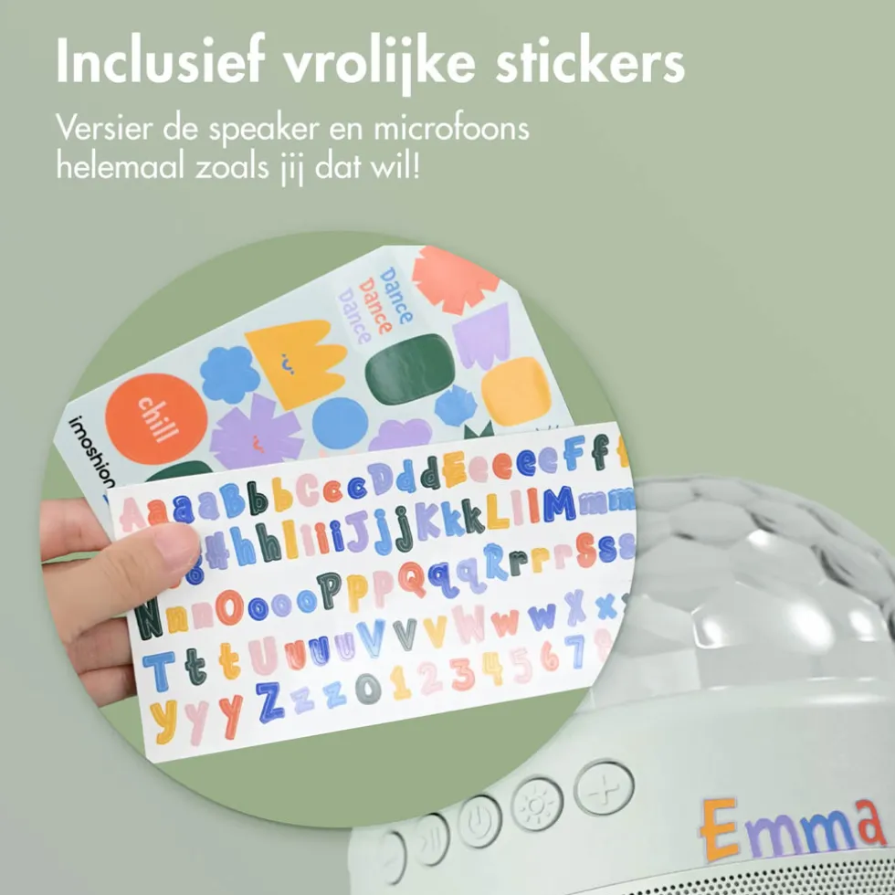 Zing de sterren van de hemel en dans alsof niemand kijkt! Met de Sing & Shine Karaoke Set vier je overal een feestje. Koppel de speaker eenvoudig via Bluetooth of een AUX-kabel aan je telefoon of tablet en speel je favoriete muziek af. De twee microfoons, met speciale geluidseffecten, hebben een lange batterijduur. De discobal met RGB verlichting op de speaker maakt het feestje helemaal compleet!Speaker en discobal in éénZet de Sing & Shine speaker aan en de RGB discobal gaat automatisch aan. Met de knop op de speaker wissel je tussen maar liefst 5 verschillende lichteffecten. Extra leuk in het donker tijdens een discofeestje! De speaker zorgt voor goed geluid en dankzij de knoppen regel je gemakkelijk het volume of ga je naar een volgend/vorig nummer.Twee microfoons vol verrassingenDe Karaoke set komt met twee microfoons zodat je alleen óf samen kunt zingen. Op de microfoons zitten verschillende geluidseffecten die zorgen voor een grappig geluid. Ga je voor de echo stem? Of kies je uit de 4 verschillende magische stemmen? Omdat de speaker een draadloos bereik tot wel 15 meter heeft, dans je de gehele kamer rond met je microfoon! Wanneer je de microfoons even niet gebruikt, hang je deze eenvoudig op aan de speaker zodat je ze niet kwijtraakt.Lange batterijduur en makkelijk meenemenBij de set krijg je een USB-C oplaadkabel waarmee je de speaker binnen twee uur volledig oplaadt. De microfoons zijn binnen 2-4 uur opgeladen. Vervolgens kan de speaker 5 uur lang muziek draaien voordat je weer moet opladen. De batterijduur van de microfoons is maar liefst 22 uur.Dankzij het compacte formaat en het handvat is de Sing & Shine Karaoke set gemakkelijk mee te nemen. De speaker weegt maar 830 gram. Ideaal voor op reis of mee naar vrienden. Zo vier je overal een feestje!Makkelijk verbinden op meerdere manierenJe koppelt de speaker via Bluetooth. Zo bedien je de speaker gemakkelijk via je telefoon of tablet. Een andere optie is het aansluiten van een AUX-kabel (niet inbegrepen). Sluit de kabel aan op de AUX-ingang en audiobron, bijvoorbeeld een telefoon. Druk meerdere keren op de aan/uit knop om de AUX-in modus te activeren. Heb je je favoriete muziek op een Micro-SD-kaart staan? Ook deze plaats je eenvoudig in de speaker om vervolgens je muziek af te spelen.Inclusief vrolijke stickersWist je dat je twee leuke stickervellen krijgt bij de karaoke set? Met deze vrolijke stickers in verschillende kleuren versier je de speaker en microfoons helemaal zoals jij dat wil. Plak bijvoorbeeld jullie namen op de microfoons zodat je altijd je eigen microfoon hebt!Waarom de imoshion Sing & Shine Karaoke set?