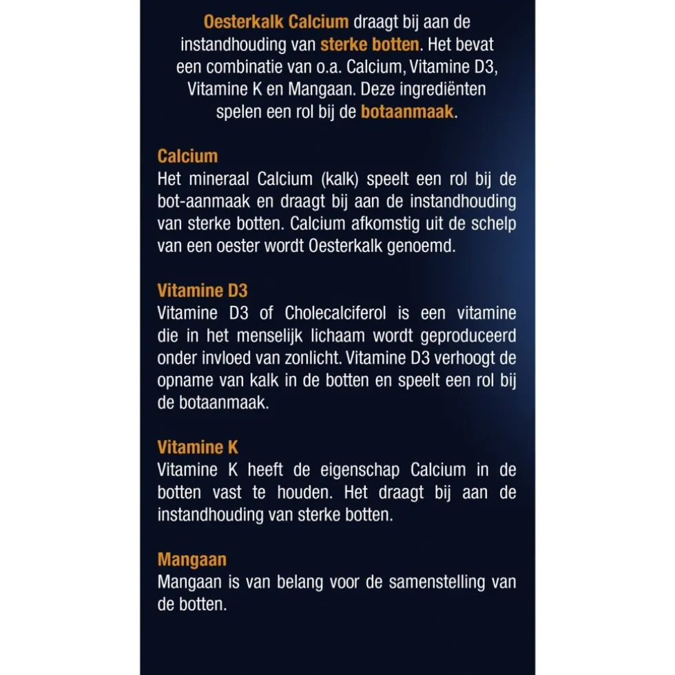 Lucovitaal Oesterkalk Calcium Vitamine D3 & K Tabletten bevatten onder andere oesterkalk, calcium, vitamine D, vitamine K en mangaan. Deze ingrediënten spelen een rol bij het behoud van sterke botten.