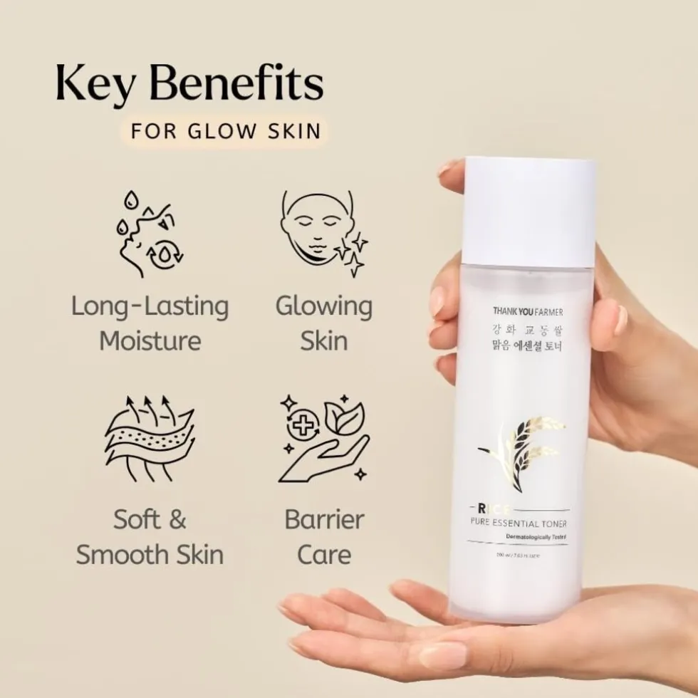 THANK YOU FARMER Rice Pure Essential Toner is een lichte,hydraterendetoner die de huid helpt teverzachtenen tebalanceren. Verrijkt metrijstextracten andere natuurlijke ingrediënten, ondersteunt het de huid bij hetherstellen van de natuurlijke pH-waardeen bereidt het de huid voor op de volgende stappen in de verzorgingsroutine. De zachte formule trekt snel in, laat de huidfrisengehydrateerdaanvoelen, en is geschikt voor alle huidtypes, vooral de gevoelige huid.