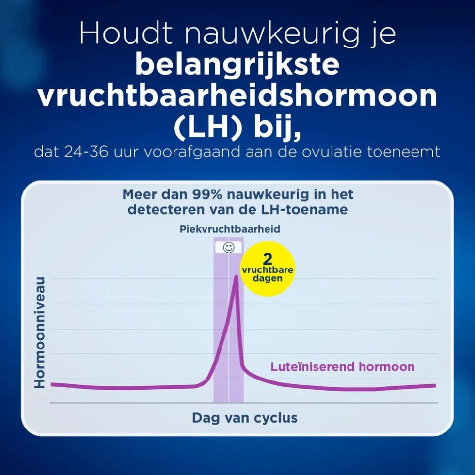 • Meer dan 99% nauwkeurig bij het detecteren van de toename van luteïniserend hormoon (LH). Hormonen zijn een meer nauwkeurige voorspeller van ovulatie dan de basale lichaamstemperatuur die pas na de ovulatie stijgt