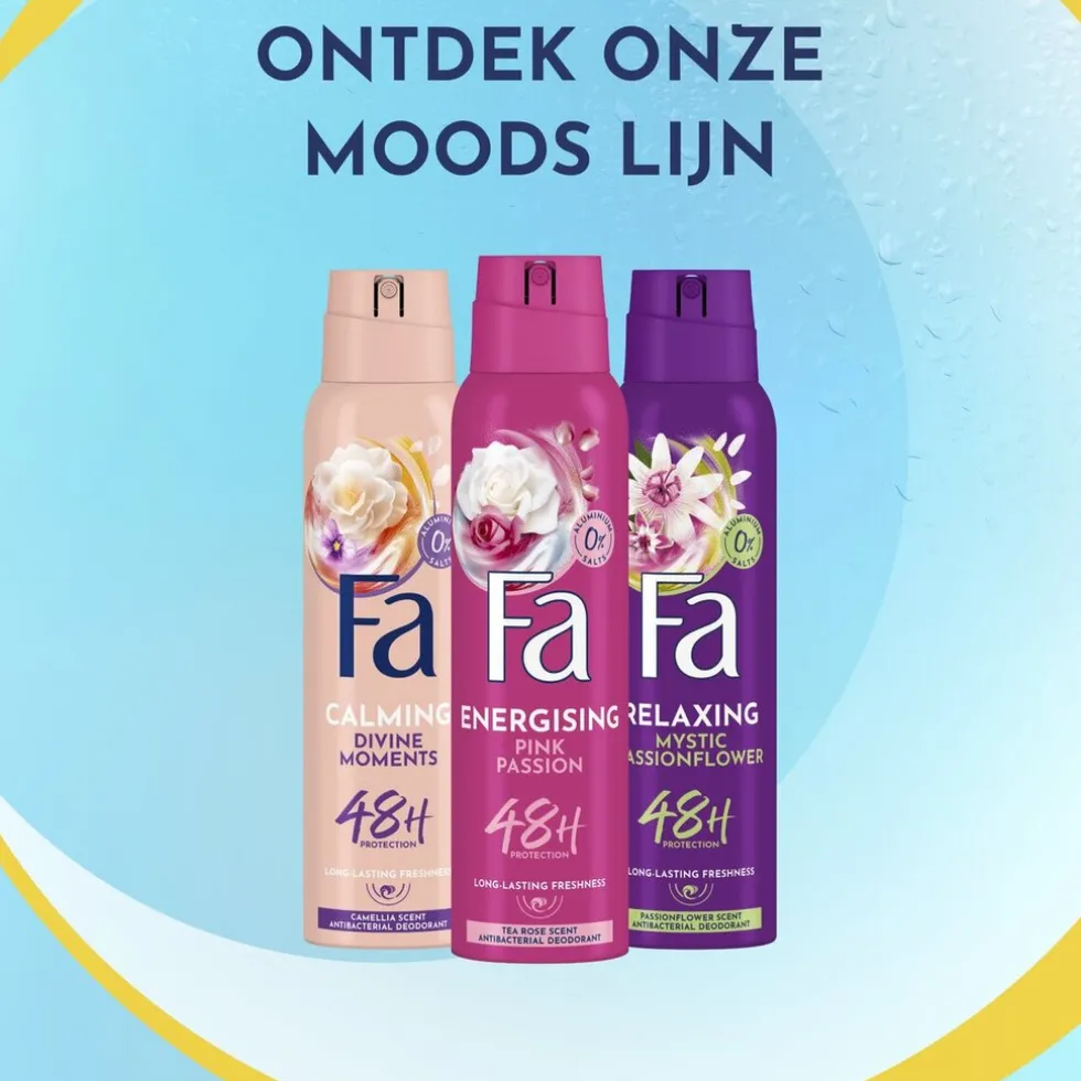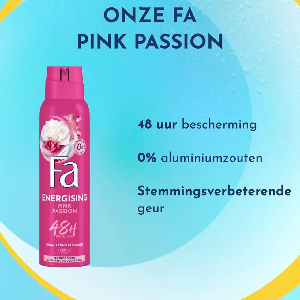 Met meer dan 70 jaar expertise in lichaamsverzorging presenteert Fa Pink Passion deodorant voor vrouwen. Omarm een bloemige ervaring met Fa’s stemmingsverhogende geur* van theeroos, zwarte bes en vanille. Deze Fa deodorantspray voor vrouwen biedt tot 48 uur geurbescherming. Het bestrijdt effectief geurveroorzakende bacteriën en garandeert een langdurige bescherming. De deo heeft een dermatologisch geteste, huidvriendelijke vegan** formule en laat geen vlekken achter.