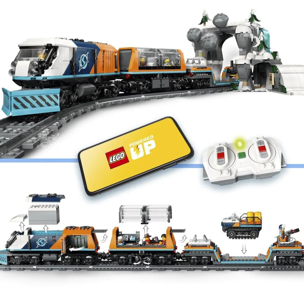 De LEGO City 60470 Onderzoekstrein Op De Noordpool bevat een op afstand bestuurbare LEGO Powered Up locomotief met een sneeuwploeg, panoramarijtuig, platte wagon en sneeuwtractor.