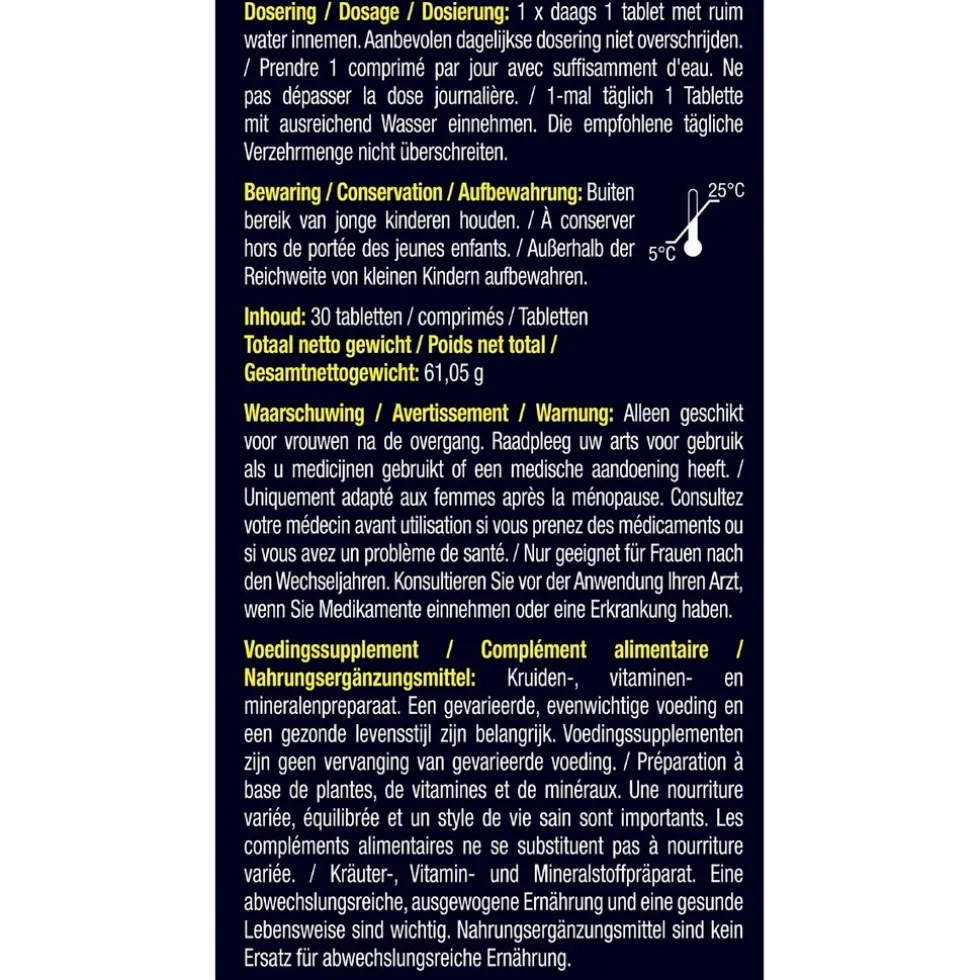 Alleen geschikt voor vrouwen na de overgang. Niet gebruiken met coumarinederivaten, zoals acenocoumarol en fenprocoumon vanwege wisselwerking. Raadpleeg uw arts voor gebruik als u medicijnen gebruikt of een medische aandoening heeft.