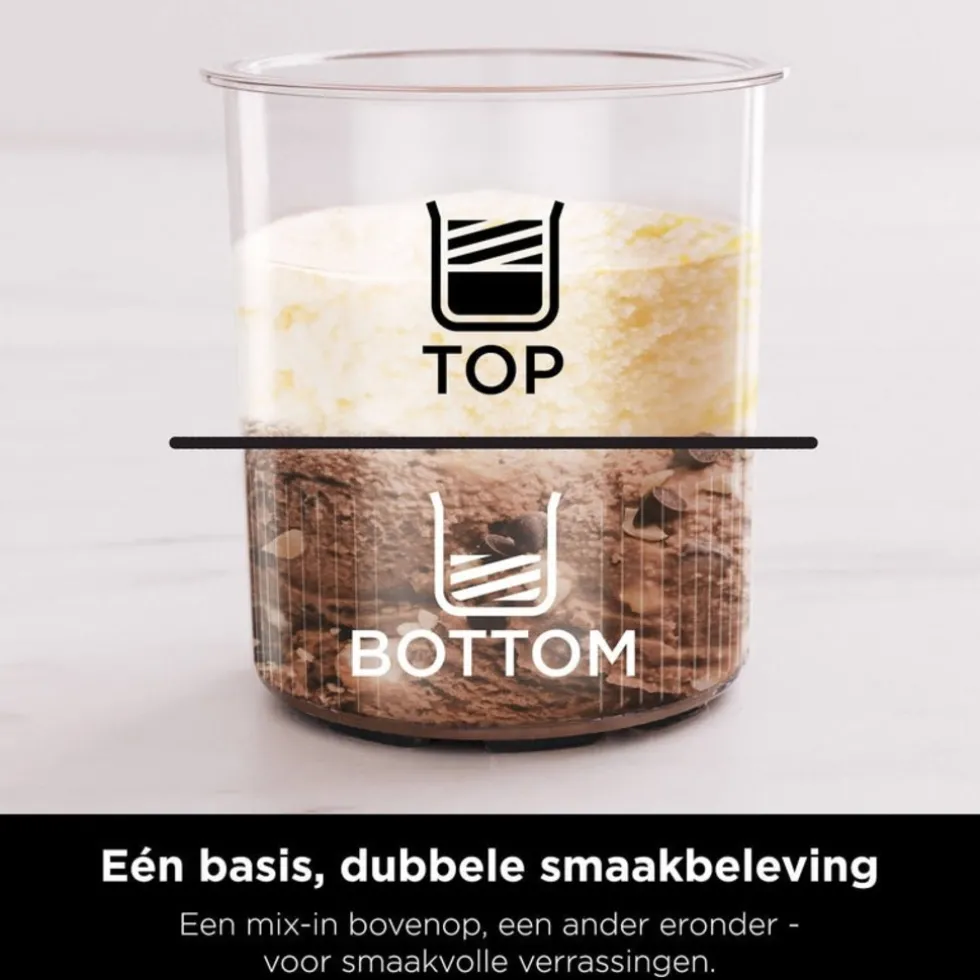Maak van één bevroren basis twee afgewerkte smaken – één in de bovenste helft van de Deluxe Tub en de andere onderaan. Je kunt zelfs de bovenste helft verwerken om nu van te genieten en de rest bewaren voor later met de Re-Spin-functie.