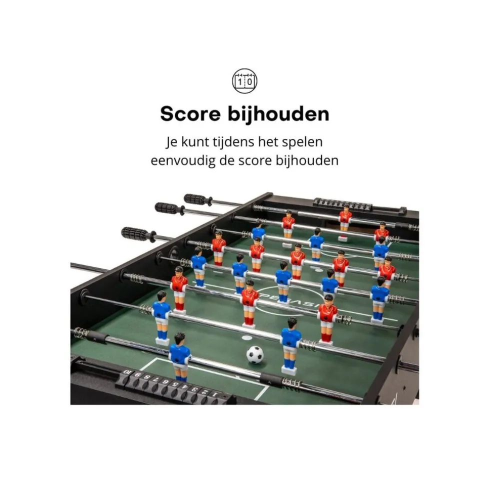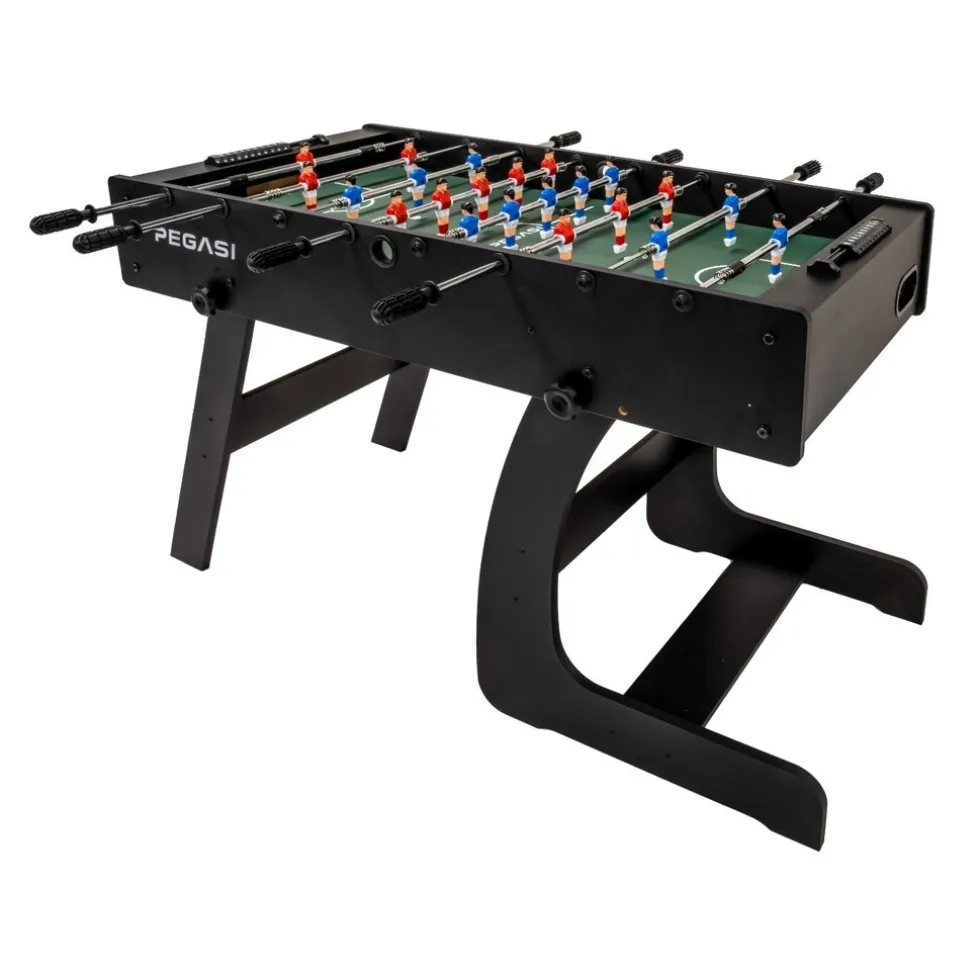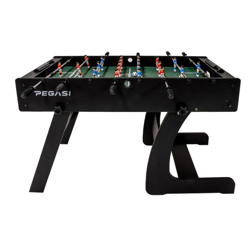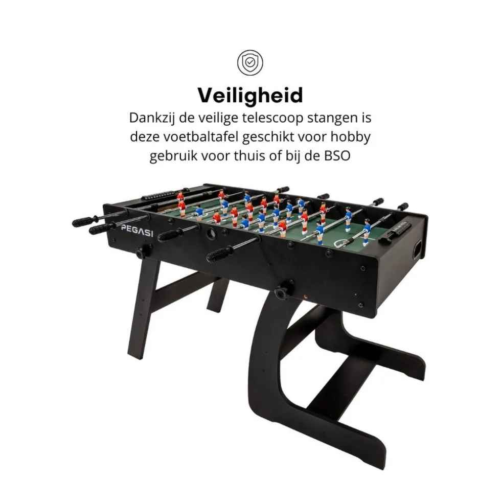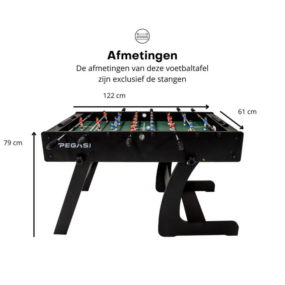 Deze inklapbare voetbaltafel is van het merk Pegasi, geschikt voor hobby gebruik thuis of BSO. Dit populaire model heeft een strak design met veilige telescoop stangen en inklapbaar onderstel. De inklapbare voetbaltafel wordt geleverd incl. balletjes.
