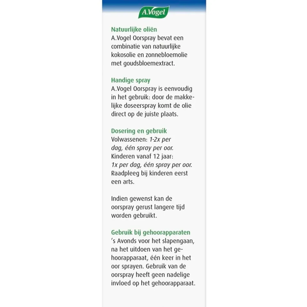 A.Vogel adviseert volwassenen 1 à 2 keer per dag de oorspray te gebruiken en 1 spray per oor. Zonder onderbreking kun je de oorspray maximaal 30 dagen gebruiken. In andere gevallen kan de spray gerust langer worden gebruikt. Voor kinderen is het advies 1 keer per dag 1 spray per oor. Dit als door de arts is vastgesteld dat de oorklachten geen andere behandeling nodig hebben. De arts bepaalt hoe lang de oorspray gebruikt mag worden.