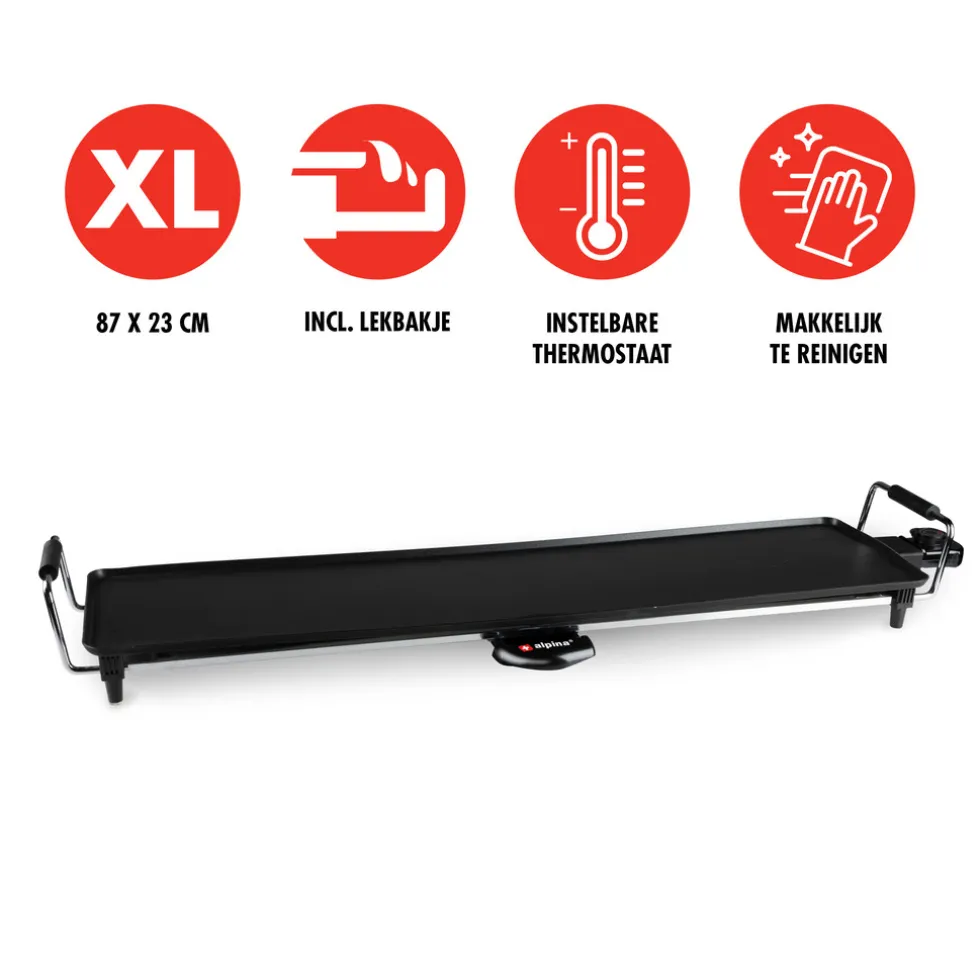 Gezellig samen bakplaten, bijvoorbeeld tijdens de feestdagen? Met deze extra grote teppanyaki grillplaat schuift iedereen aan om zijn eigen kostje te maken, terwijl je heerlijk bijpraat.XL-versieDeze elektrische bakplaat heeft een extra groot oppervlak, zodat je met veel personen tegelijk kan aanschuiven. De grillplaat is zo’n 87 centimeter lang en circa 23 centimeter breed. Dat geeft je een grilloppervlak van maar liefst 0,2 m².Social diningHet eten van een bakplaat wordt, net als gourmetten en racletten, ook wel ‘social dining’ genoemd. Het heeft dan ook als groot voordeel dat je als gastheer of gastvrouw meer tijd met je gasten kan doorbrengen. Bereid het goed voor, zet alles op tafel en schuif gelijk met je gasten aan om samen het eten te bereiden en op te eten. Kokkerellen doe je dus samen aan tafel, in plaats van alleen in de keuken. Dat mag je met recht sociaal noemen.Favoriet gerechtEen ander voordeel van zelf je eten bereiden, is dat ieder precies datgene uitkiest wat hij of zij lekker vindt. Ben je een liefhebber van vlees of vis, eet je liever vegetarisch of bijvoorbeeld koolhydraatarm? Haal de juiste boodschappen in huis en ieder maakt zijn favoriete maaltje op de bakplaat.Gemakkelijke bedieningDeze teppanyaki bakplaat werkt heel gemakkelijk. Sluit de stekker aan op een stopcontact en stel de temperatuur in met de draaiknop. De instelbare thermostaat draai je van de uit-stand (‘off’) naar een warmtevariatie van 1 tot en met niveau 5. Het controlelampje gaat branden tijdens het opwarmen.Zodra deze ingestelde temperatuur is bereikt, gaat de temperatuurindicator uit.Handvatten en lekbakjeJe tilt de bakplaat heel gemakkelijk op bij de handvaten. Een andere handige functionaliteit is het lekbakje dat is inbegrepen. Dit bakje vangt bijvoorbeeld het vet op en je kan hier ook vastgekoekte etensresten naartoe schuiven met een houten spatel. De teppanyaki-plaat is bovendien gemakkelijk te reinigen.Details teppanyaki bakplaat