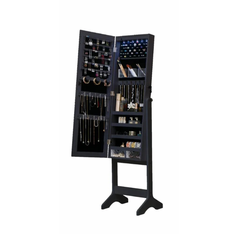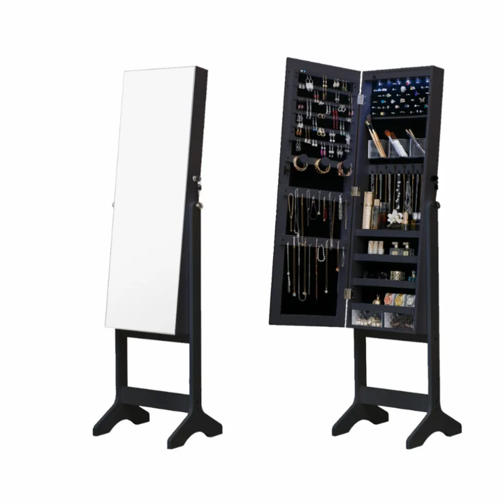 De ingebouwde spiegel voegt functionaliteit toe aan de sieradenkast, zodat je je accessoires kunt passen en je uiterlijk kunt controleren zonder een aparte spiegel nodig te hebben. Deze functie maakt het een praktische toevoeging aan je kleedruimte.