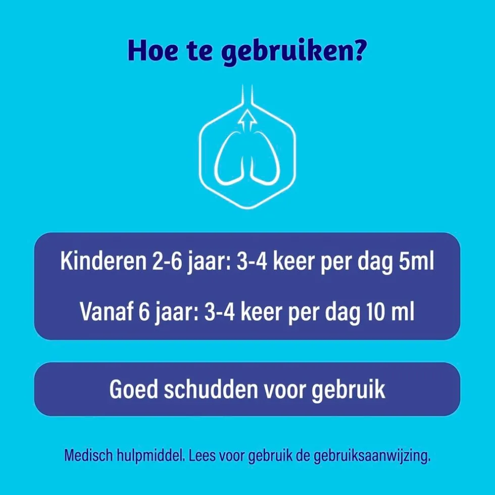 Dosering; * Kinderen van 2-6 jaar: 3-4 keer per dag 5ml * Vanaf 6 jaar en volwassenen: 3-4 keer per dag 10 ml. Goed schudden voor gebruik en lees voor gebruik de gebruiksaanwijzing. Te gebruiken voor kinderen vanaf 2 jaar onder toezicht van volwassenen. Alleen voor oraal gebruik. Niet gebruiken bij overgevoeligheid voor één van de ingrediënten. Niet geschikt voor diabetici. Raadpleeg voor gebruik eerst de huisarts tijdens zwangerschap en borstvoeding.