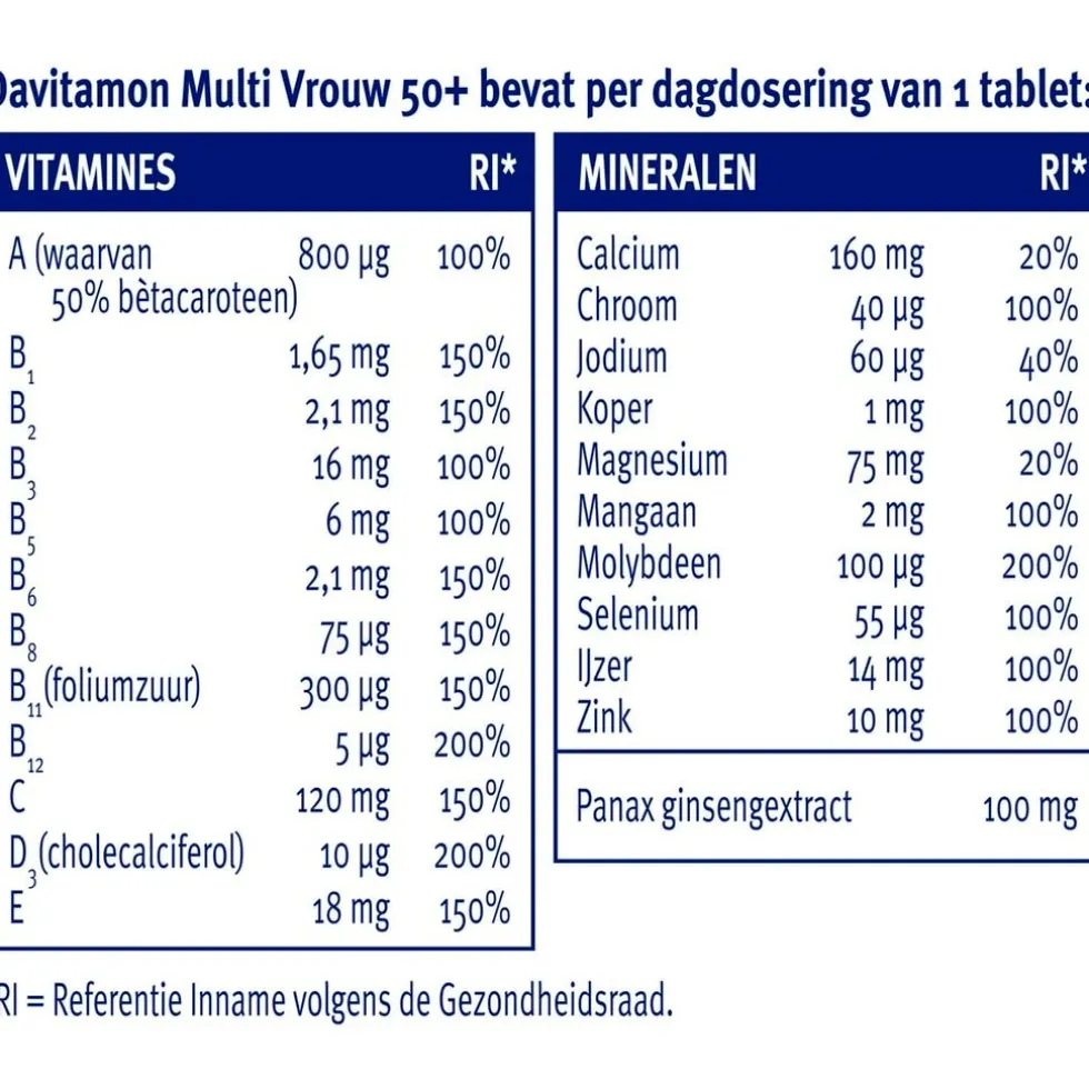 Samenstelling:#Davitamon Multi Vrouw 50+ bevat per dagdosering van 1 tablet:#Vitamines;RI*#A (waarvan 50% bètacaroteen);800;µg;100%#B1;1,65;mg;150%#B2;2,1;mg;150%#B3;16;mg;100%#B5;6;mg;100%#B6;2,1;mg;150%#B8;75;µg;150%#B11 (foliumzuur);300;µg;150%#B12;5;µg;200%#C;120;mg;150%#D3 (cholecalciferol);10;µg;200%#E;18;mg;150%#Mineralen; RI*#calcium;160;mg;20%#chroom;40;µg;100%#jodium;60;µg;40%#koper;1;mg;100%#magnesium;75;mg;20%#mangaan;2;mg;100%#molybdeen;100;µg;200%#selenium;55;µg;100%#ijzer;14;mg;100%#zink;10;mg;100%#panax ginsengextract;100;mg#