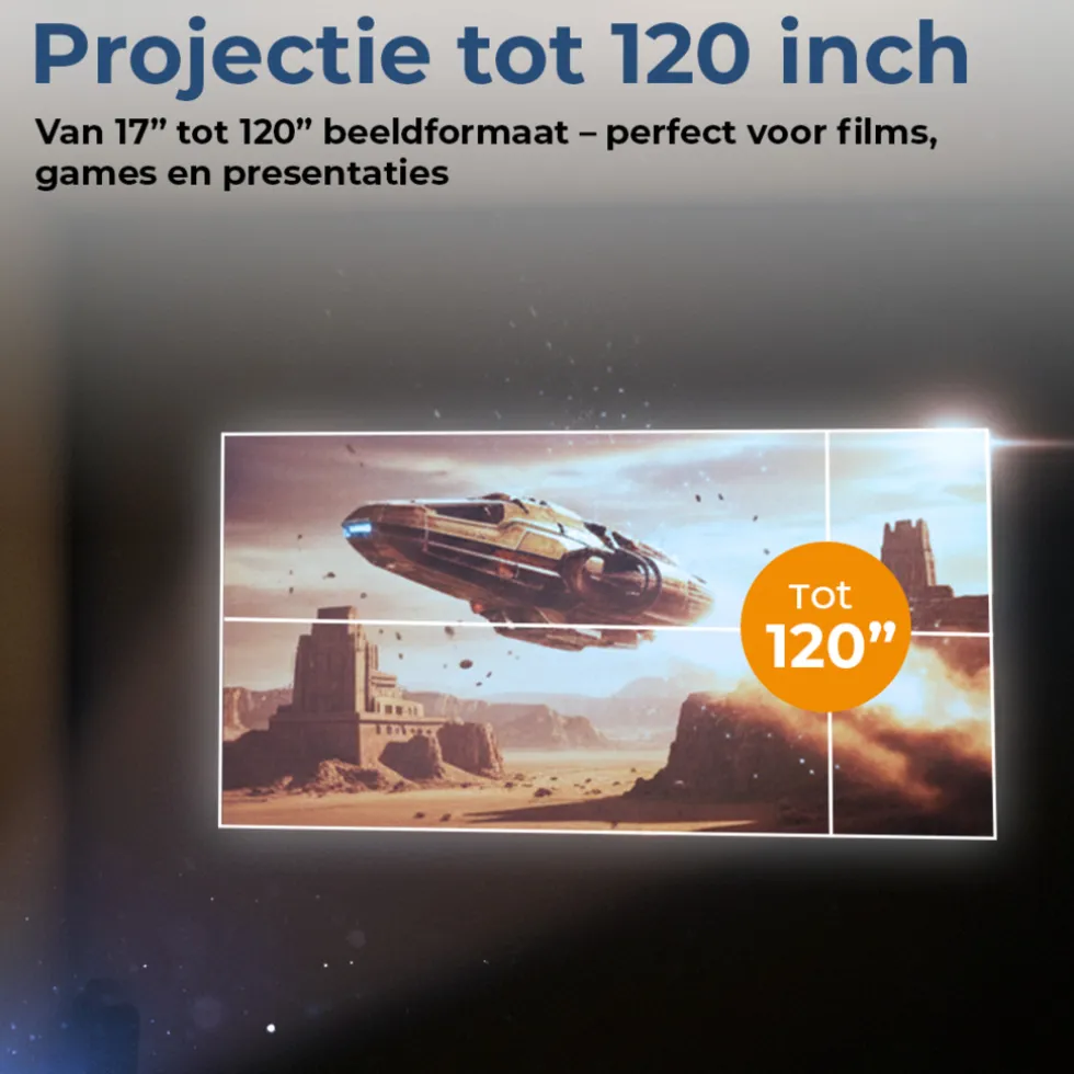 De mini beamer projecteert van 17″ tot wel 120″ – ideaal voor zowel filmavonden in de woonkamer als zakelijke presentaties. Dankzij handmatige focus en een 180° draaibare projectorkop pas je het beeld eenvoudig aan voor elke ruimte. Sluit snel je laptop, smartphone of tablet aan via HDMI of USB-C en je bent klaar om te presenteren of te ontspannen.