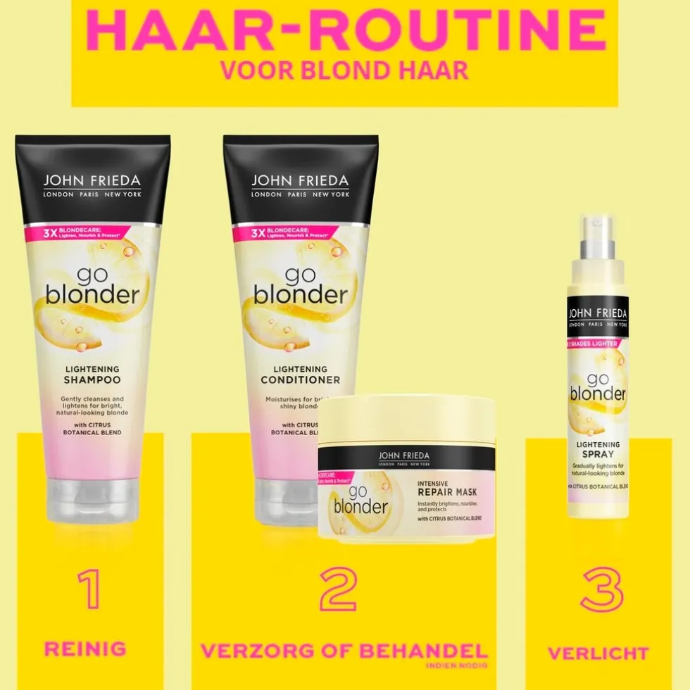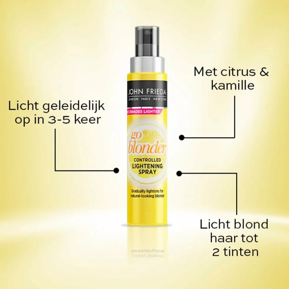 John Frieda Sheer Blonde Go Blonder Controlled Lightening Hairspray licht je haar geleidelijk op in drie tot vijf keer. De spray is geschikt voor blond haar.