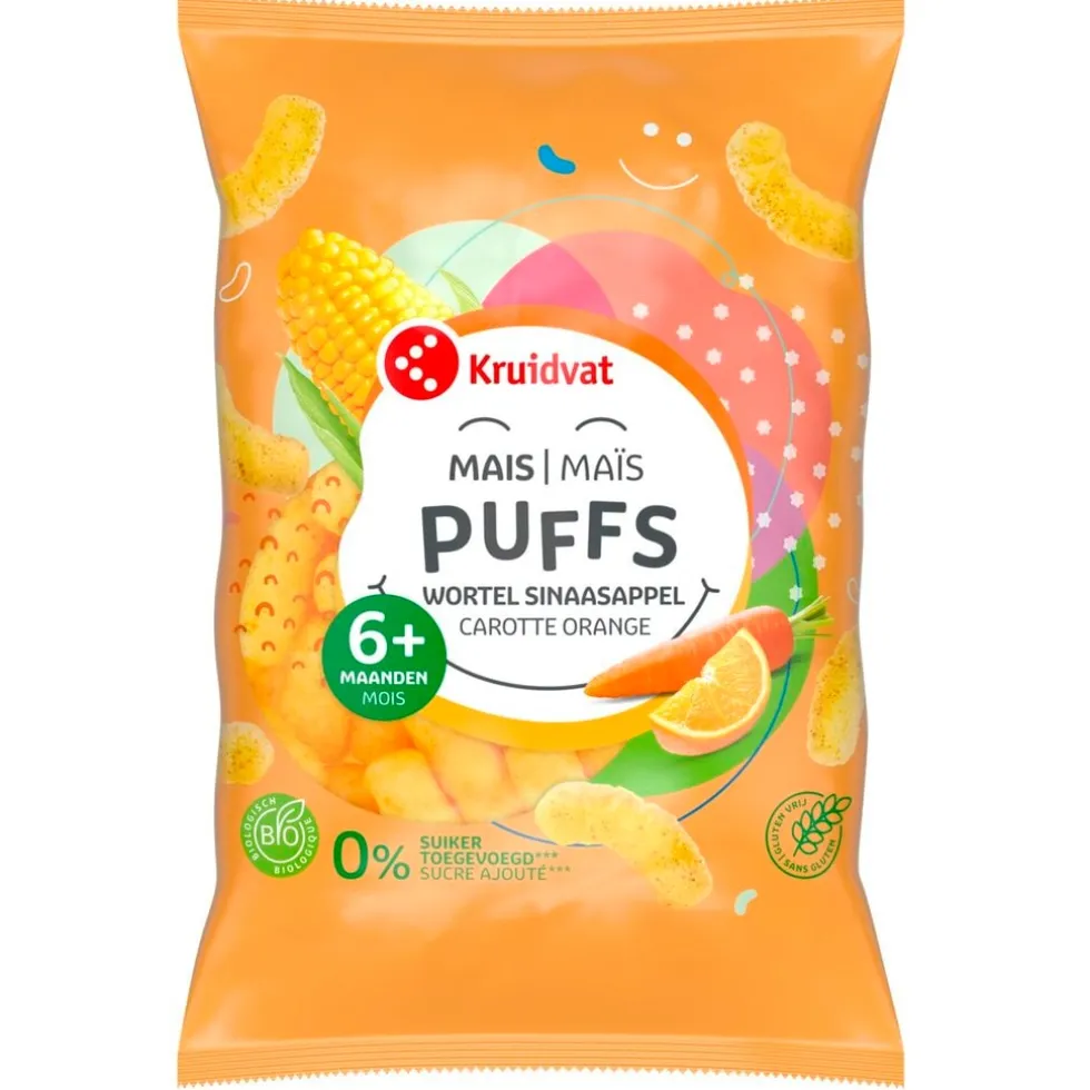 De Kruidvat 6+M Bio Sinaasappel en Wortel Maïspuffs zijn gepofte maïsknabbels. Ze zijn precies groot genoeg zodat je kindje ze zelf oppakt en opeet. Ze smelten in de mond.