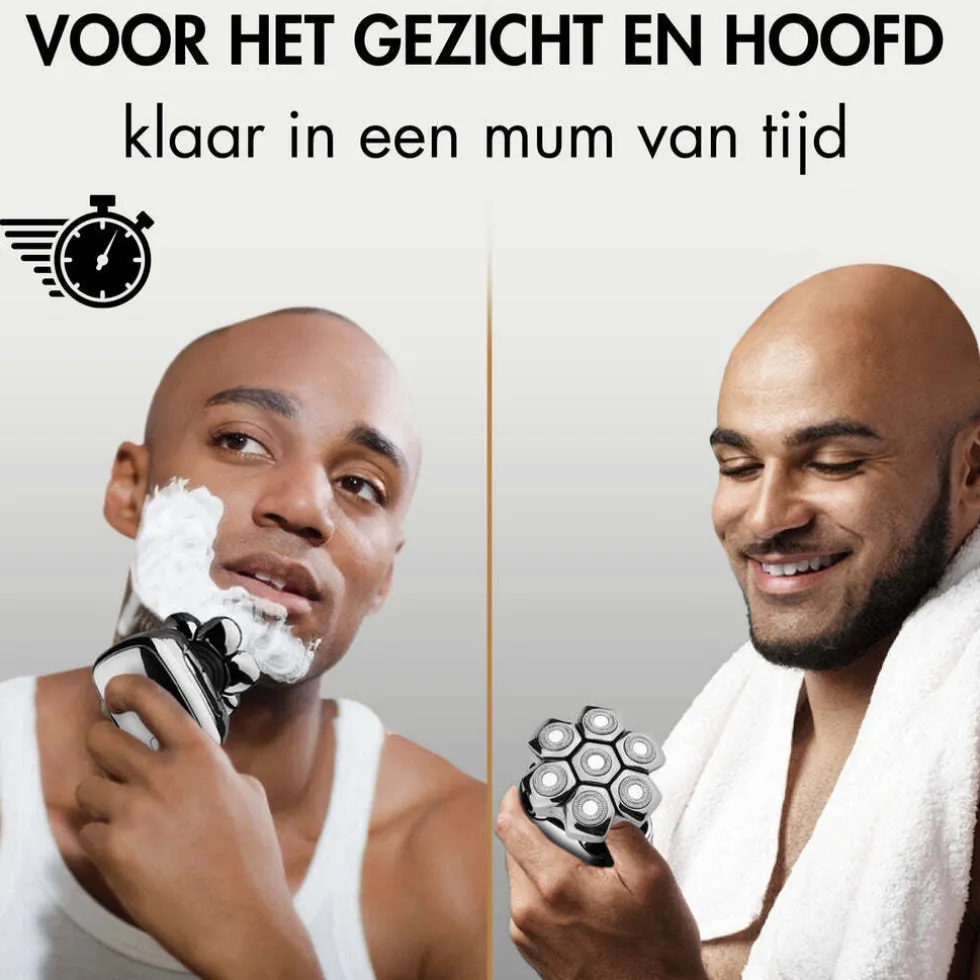 - Sneller de deur uit! – De 7 flexibele scheerkoppen zorgen voor een verbluffende scheerervaring, en dat binnen enkele minuten! Zo kun je sneller de deur uit; vaarwel oneindige scheerbeurten met een scheermes!