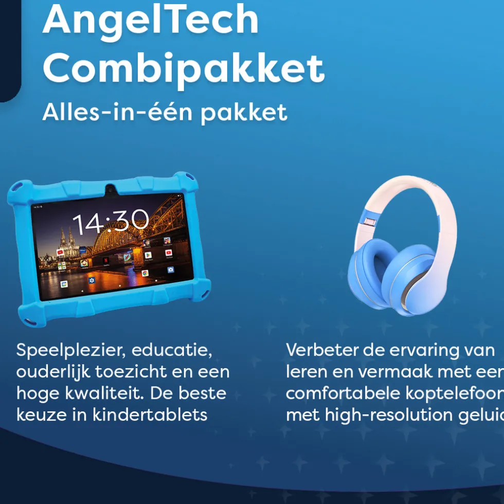 Ontdek het AngelTech Kinderpakket SLIM! Dit complete pakket omvat de indrukwekkende AngelTech Kindertablet SLIM – eenkindertablet van topkwaliteit en snelle prestatiesen de AngelTechOver-Ear Kinderkoptelefoon, met ingebouwdekindvriendlijke volumebegrenzingen methoog kwaliteit surround-sound. Met dit combipakket ontvang je alles wat je nodig hebt!