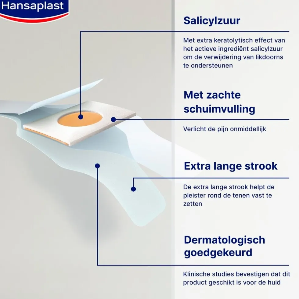 Hansaplast Likdoornpleisters met salicylzuur verlichten onmiddellijk de pijn van druk en wrijving en helpen de likdoorn te verwijderen.