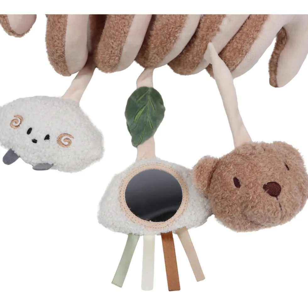 Aan de spiraal hangen drie lieve speeltjes: een vrolijk wolkje, een zacht teddy schaapje en natuurlijk Bowie de Beer zelf. Ieder speeltje biedt iets unieks: een veilig spiegeltje, een squeeze geluidje en verschillende stoffen die de zintuigen van je kindje prikkelen. Leuk om naar te kijken, nog leuker om te ontdekken!