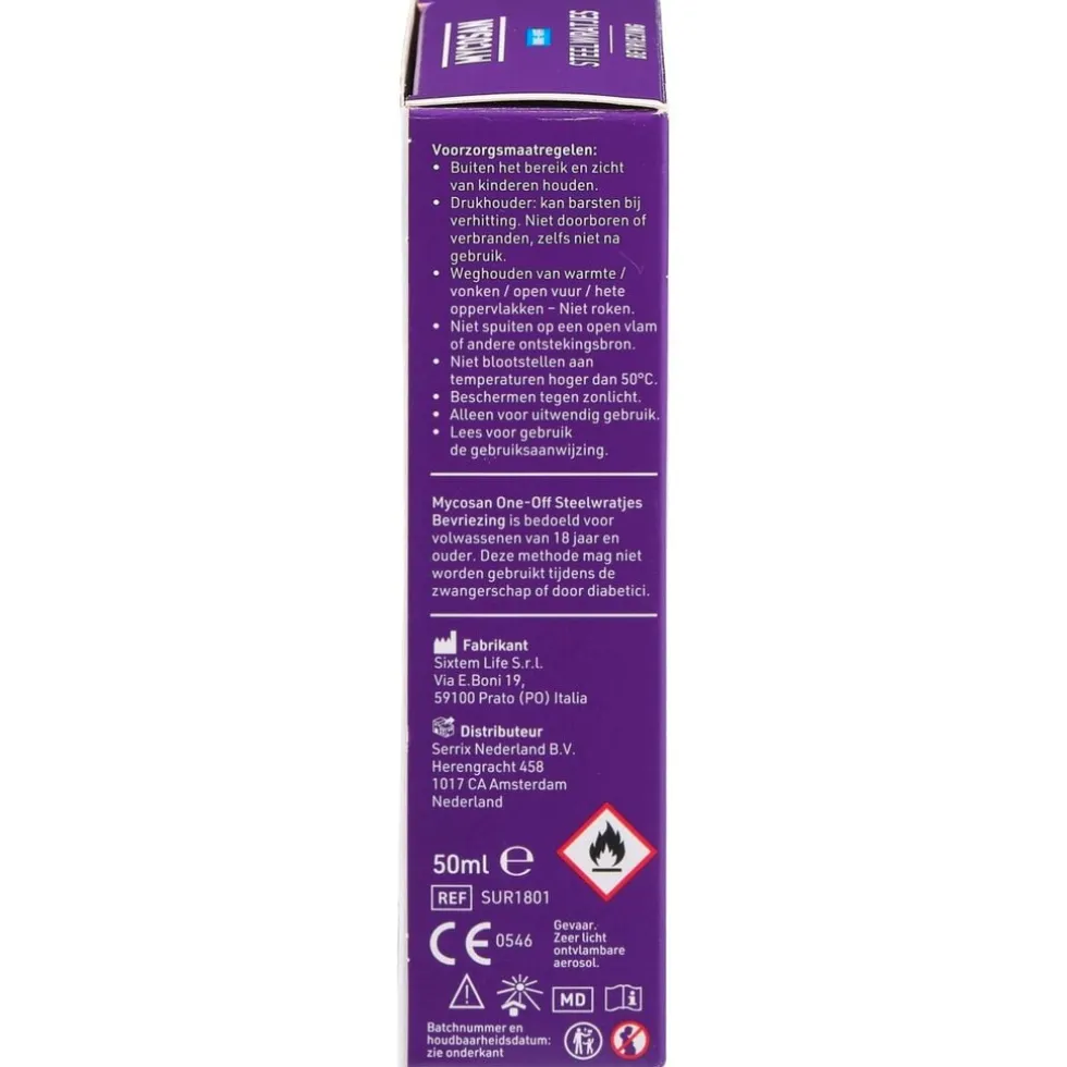 vonken / open vuur / hete oppervlakken – Niet roken. Niet spuiten op een open vlam of andere ontstekingsbron. Niet blootstellen aan temperaturen hoger dan 50°C. Deze methode mag niet worden gebruikt tijdens de zwangerschap of door diabetici. Gevaar. Zeer licht ontvlambare aerosol. Steelwratten die zich bevinden in het gezicht, op de borst of de geslachtsdelen. Als u niet zeker weet of het een steelwrat is, voer de behandeling dan niet uit. Raadpleeg bij twijfel uw arts.