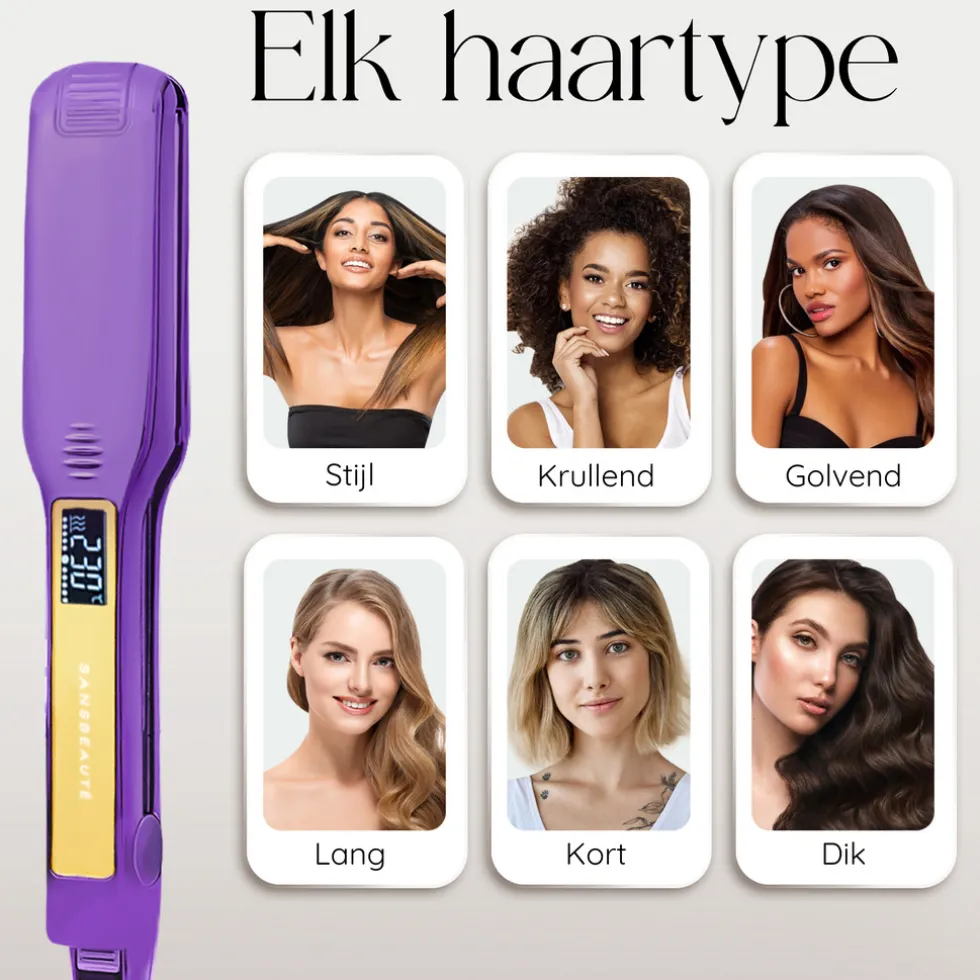 ✓ Voor elk haartype – Dankzij onze geavanceerde Platinum Plates technologie geniet je van een snelle en efficiënte stylingervaring, ongeacht je haartextuur. Of je nu fijn, dik, krullend, steil, golvend, of alles daar tussenin hebt, onze stijltang is ontworpen om aan al jouw stylingbehoeften te voldoen. Met de Sansbeauté® Stijltang bereik je moeiteloos de perfecte look, ongeacht jouw unieke haarstructuur.