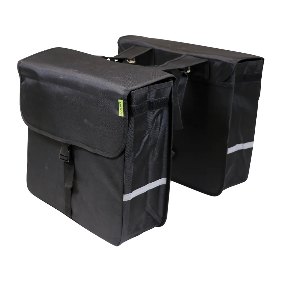 Dubbele zwarte fietstas met reflecterende accenten. Makkelijk te bevestigen op de bagagedrager door de verstelbare banden. De fietstassen zijn gemaakt van waterafstotend nylon met klittenbandsluiting en een verstelbare snel sluiting. Daarnaast zijn de tassen voorzien van extra verstevigde wanden.