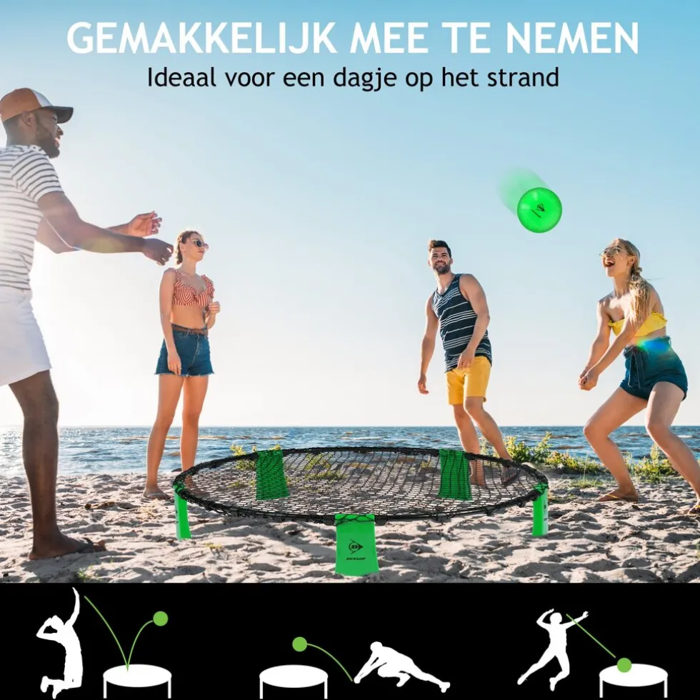 Het Dunlop spyderball spel wordt als complete set geleverd. In de set vindt je het frame bestaande uit 5 stukken, 5 poten, het roundnet, een bal, een pomp om de bal mee op te pompen en een handige draagtas. Montage is snel en zeer gemakkelijk, maar moet wel onder toezicht van een volwassene gebeuren. Wanneer je de slam ball set niet gebruikt kun je hem het beste afbreken en veilig opbergen in de bijgeleverde reistas zodat hij zo lang mogelijk mee gaat. In deze reistas kun je de spyderball set ook gemakkelijk meenemen naar een middag in het park, een dagje aan het strand en zelfs op vakantie. Dankzij de afmetingen van 90 x 20 centimeter kun je spyderball ook binnen spelen, mits daar voldoende ruimte voor is.
