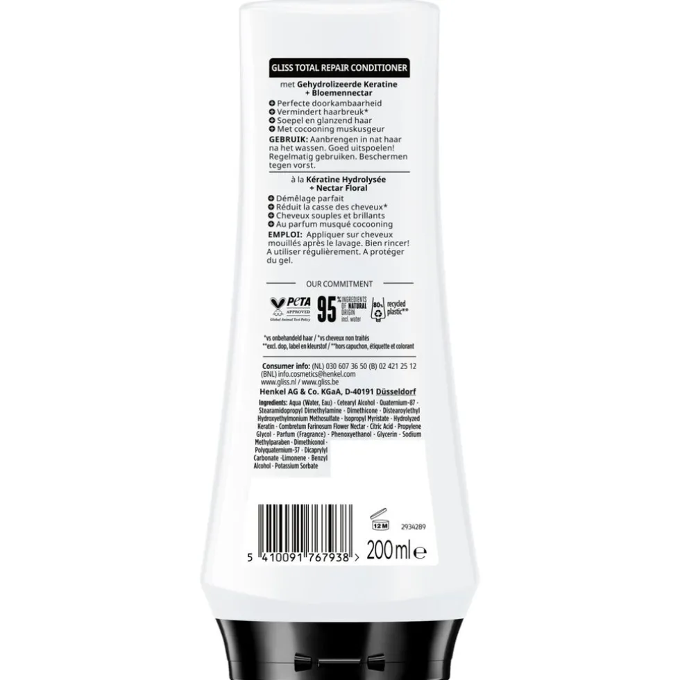 De Gliss Total Repair Regeneration Conditioner is een regeneratieconditioner voor droog, beschadigd haar. Het herstelt je haar en vermindert haarbreuk (ten opzichte van onbehandeld haar).