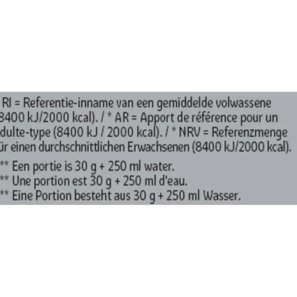 Samenstelling:# Voedingswaardevermelding per;100 g poeder; ; ;portie***; ; ;%RI*per portie***# Energie;1616 kJ /;382 kcal;485 kJ/;115 kcal;6%# Vetten;5,6;g;1,7;g;2%# waarvan verzadigde vetzuren;2,9;g;0,9;g;5%# Koolhydraten;6,9;g;2,1;g;1%# waarvan suikers;5,9;g;1,8;g;2%# Vezels;1,6;g;0,5;g;-# Eiwitten;75;g;23;g;45%# Zout;0,59;g;0,18;g;3%# * RI = Referentie-innamevan een gemiddelde volwassene(8400 kJ/2000 kcal).# *** Een portie is 30 g +250 ml water.# Aminozuren per;100 g poeder;; ;portie***; ; # Cystine;1,4;g;0,4;g# Methionine**;1,7;g;0,5;g# Histidine**;1,4;g;0,4;g# Isoleucine(BCAA)**;4,7;g;1,4;g# Leucine(BCAA)**;7,9;g;2,4;g# Lysine**;7,1;g;2,1;g# Fenylalanine**;2,5;g;0,7;g# Tyrosine;2,3;g;0,7;g# Threonine**;5,4;g;1,6;g# Valine (BCAA)**;4,4;g;1,3;g#Arginine;1,8;g;0,6;g# Alanine;3,7;g;1,1;g# Asparaginezuur;7,9;g;2,4;g# Glutaminezuur;13,2;g;4,0;g# Proline;4,6;g;1,4;g# Serine;4,1;g;1,2;g# Glycine;1,4;g;0,4;g# Totaal aminozuren;75,5;g;22,6;g# Totaal BCAAs;17,0;g;5,1;g
