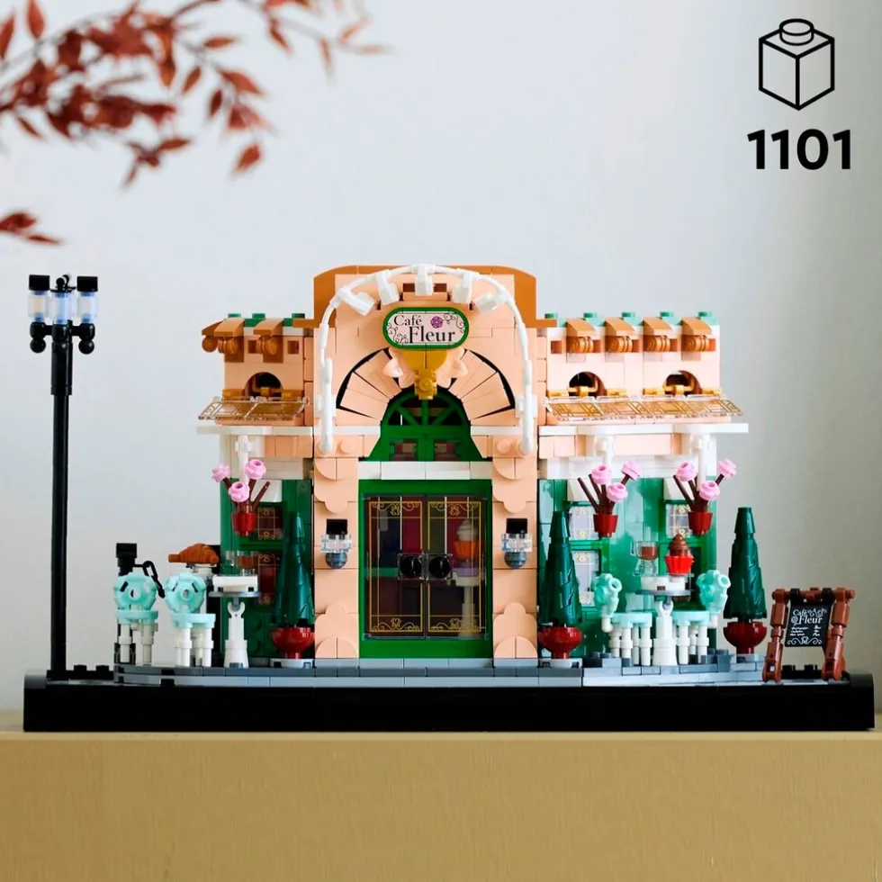 Een bouwbaar trottoir met een klassieke straatlantaarn vormt het toneel voor café Fleur met een pittoreske gevel, sierlijke stoelen, hangende bloempotten en dubbele deuren die open kunnen. Binnen vind je een gezellig interieur met chic behang en donkere houten meubels. Dit LEGO café zit boordevol slimme details en accessoires, zoals croissants, kopjes, een krant en een kassa en straalt de sfeer uit van een klassieke Franse bistro. Het slanke profiel en de platte achterkant maken dit model heel geschikt om op een plank neer te zetten als woon- of kantoordecoratie.