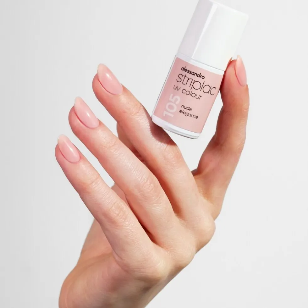 Alessandro Striplac UV Colour 105 Nude Elegance Nagellak is een lichte nude tint met een verfijnde beige ondertoon. Nude Elegance is tijdloos en geschikt voor elke gelegenheid.