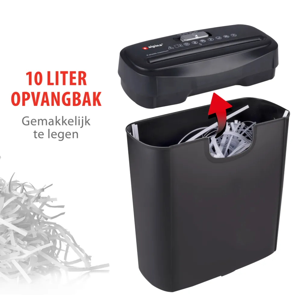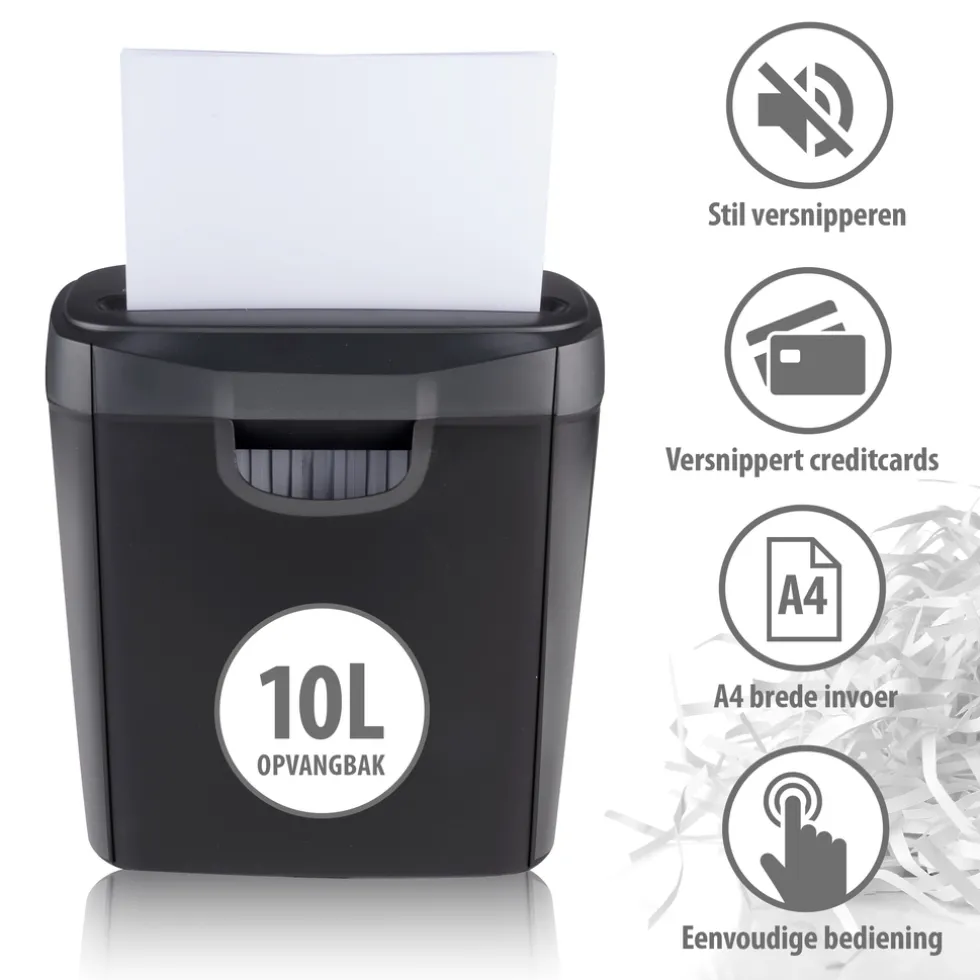 Versnipperaar voor papier: 6 A4 vellen per keerDe automatische shredder versnijdt je papier in stroken. De snijstrip snijdt per keer 6 vellen van 80 gram A4-formaat. De kleine papierstrookjes vangt hij op onder de messen, in een opvangbak van 10 liter.Gemakkelijk bedienenBedienen van de shredder gaat heel gemakkelijk. Bovenop de papierversnipperaar zit een bedieningsknop met 4 standen: