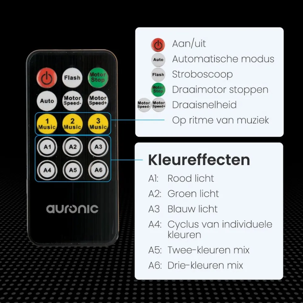 Afstandsbediening Als de lamp aan het plafond hangt kun je hem lastig met de hand bedienen. Bij Auronic krijg je er daarom een afstandsbediening bij! Bestuur de lamp vanuit iedere hoek van de kamer. Met één druk op de knop is de kamer veranderd in een feesttent.
