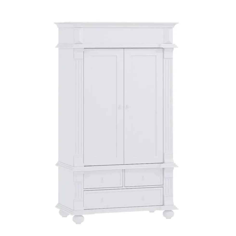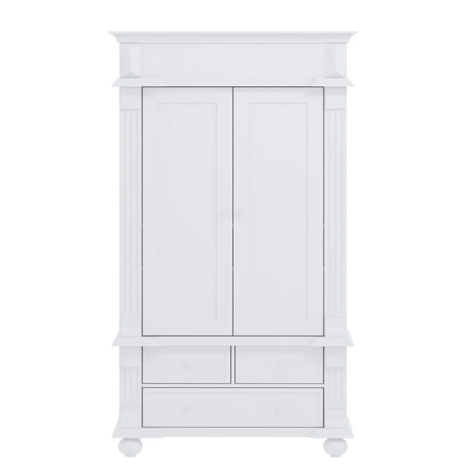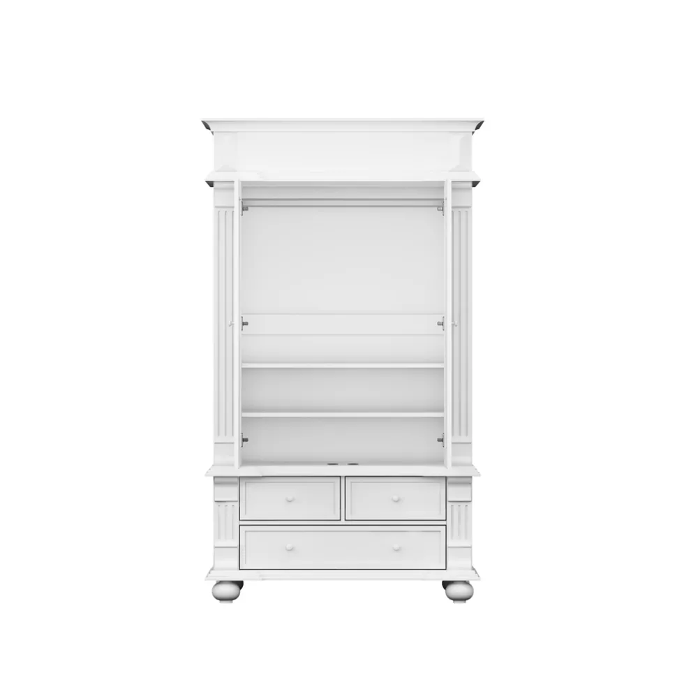De witte klassieke kledingkast heeft een tijdloos uiterlijk, waardoor je er lang plezier van zal beleven. De romantische en sierlijke details maken de kast uniek en een echte eyecatcher voor in de babykamer.