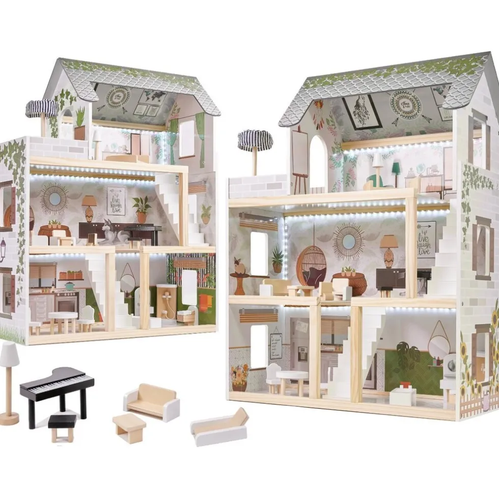 Online Ikonka Luxe Boho Stijl XL Houten Poppenhuis Met Meubels Met LED Verlichting