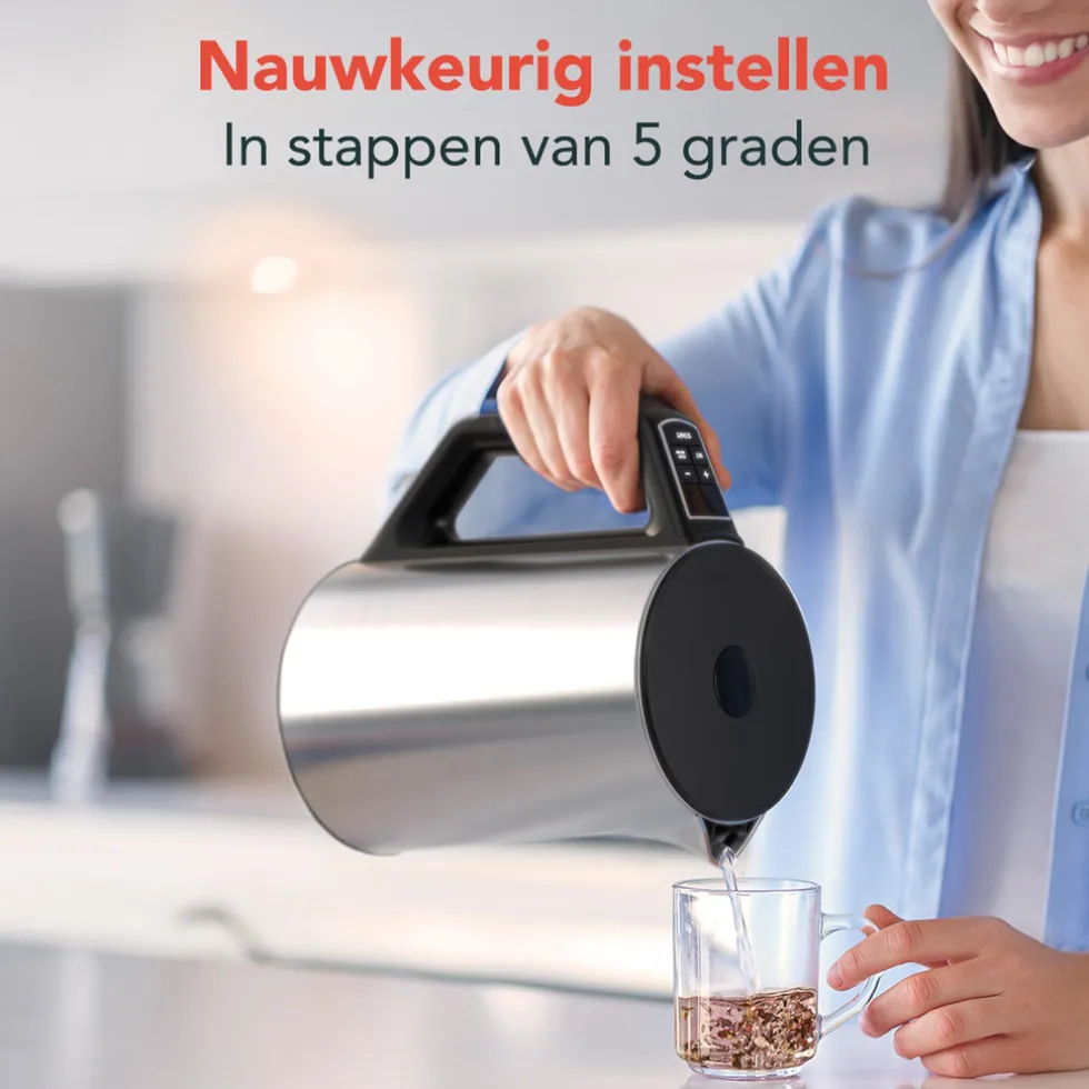 Warm water tot in perfectieOf je nu kiest voor thee of een andere warme drank, je stelt eenvoudig de perfecte temperatuur in via het digitale display van deze elektrische waterkoker. Met snelkeuzes van 40°C, 60°C, 80°C en 100°C, of de temperatuur in nauwkeurige stappen van 5°C instellen, biedt deze waterkoker met temperatuurregeling exact wat je nodig hebt voor elk type drank.