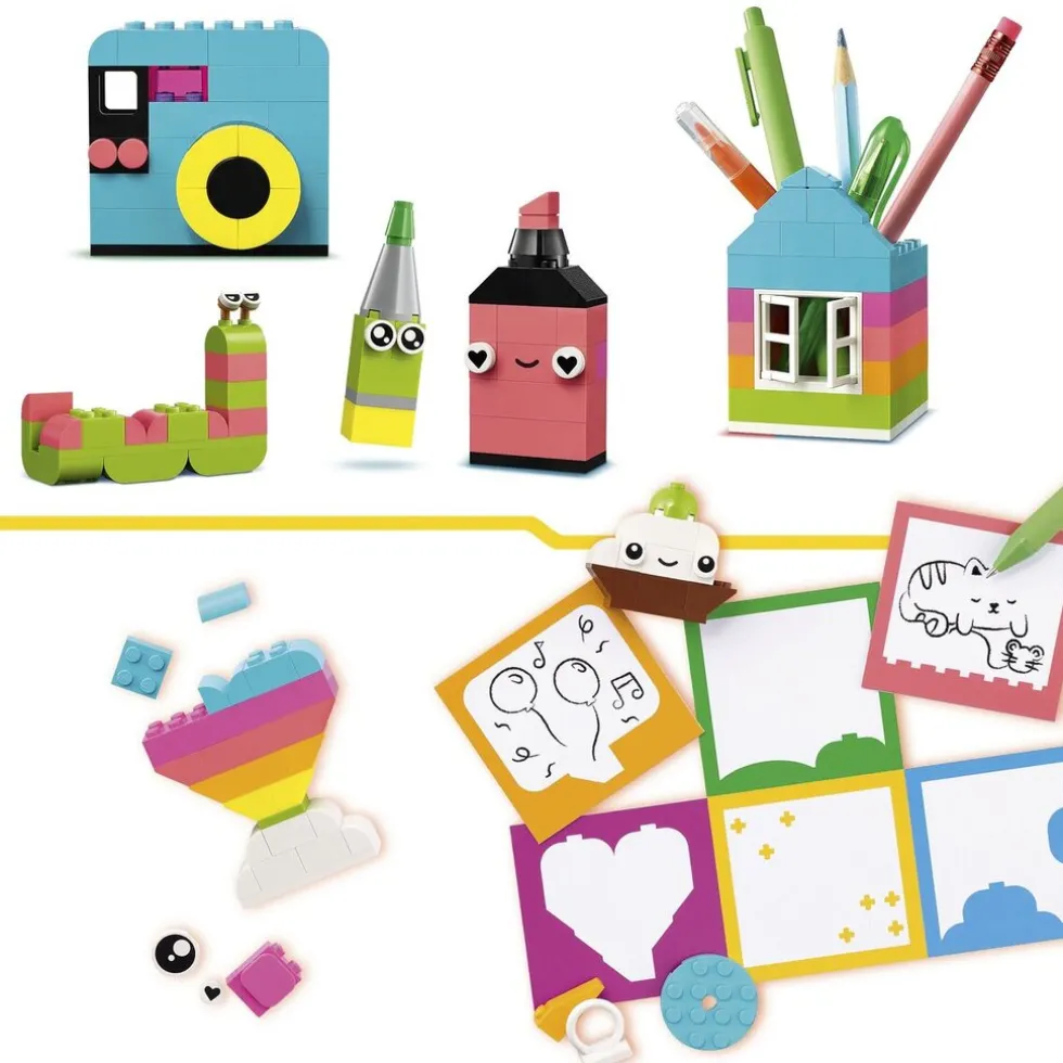 In de doos zitten veel stenen inclusief ideeën voor tien snel te bouwen modellen waar je vrolijk van wordt. De modellen bouw je om tot twaalf nieuwe speeltjes en ze je kan ze verder aanpassen voor nog meer creaties. De gids bevat inspiratie voor modellen waaronder een aap, markeerstift, sneeuwpop, regenbooghuis, drol, bij, camera, verjaardagstaart, kat, cactus, regenbooghart en vogel.