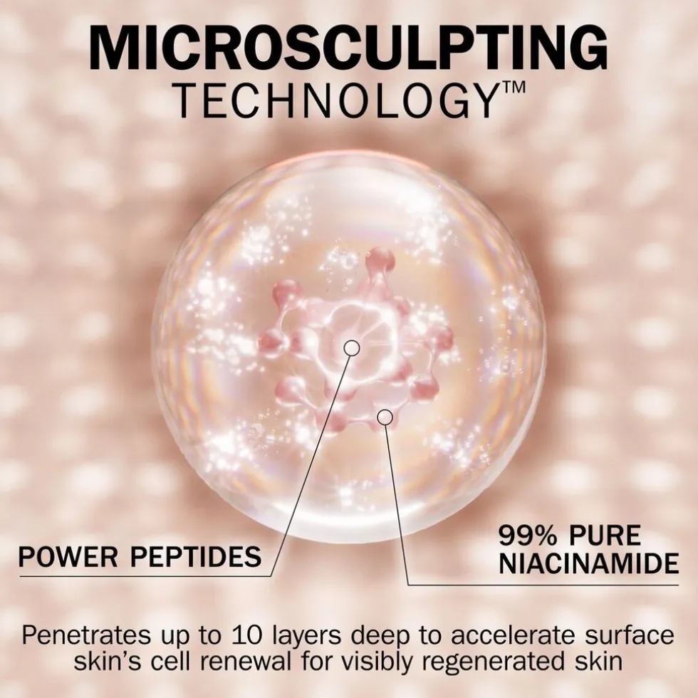 DDeze crème is ontwikkeld met microsculptuurtechnologie met krachtige peptiden en 99% pure niacinamide. Het dringt tot tien lagen diep in je huid door voor het activeren van de celvernieuwing van je oppervlaktehuid. Je krijgt een zichtbaar vernieuwde huid.
