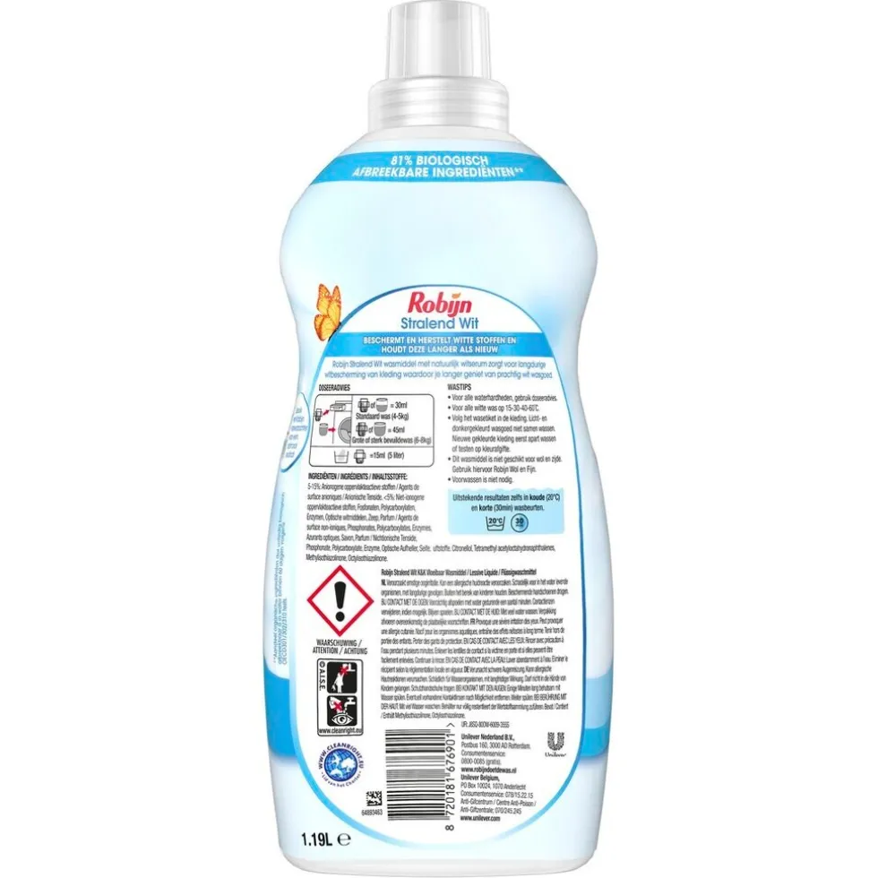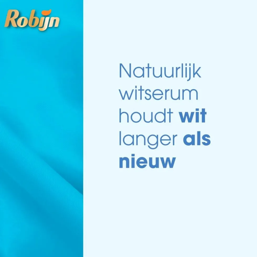 Met Robijn Klein & Krachtig Stralend Wit Vloeibaar Wasmiddel met white serum geniet je langer van prachtig wit wasgoed. Het white serum zorgt ervoor dat kleuren langer mooi blijven, omdat het pillen en pluizen uit kleding verwijdert.