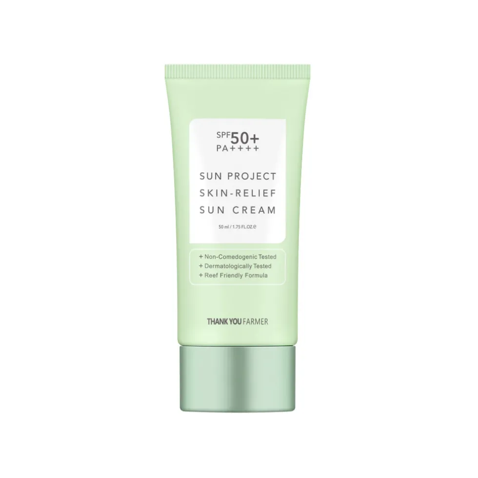 THANK YOU FARMER Sun Project Skin Relief Sun Cream is een milde, hydraterende zonnecrème die speciaal is ontwikkeld voor de gevoelige en snel geïrriteerde huid. Met SPF50+ PA++++ biedt het een krachtige breedspectrumbescherming tegen schadelijke UVA- en UVB-stralen. De formule is verrijkt met kalmerende ingrediënten zoals centella asiatica, panthenol en madecassoside, die roodheid helpen verminderen en de huidbarrière versterken. De lichte, niet-vette textuur trekt snel in en is perfect geschikt voor dagelijks gebruik, ook onder make-up. Ideaal voor wie op zoek is naar een zonnebrand die zowel beschermt als verzorgt.