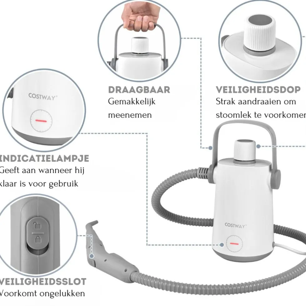 De handstoomreiniger van Costway is ideaal voor het reinigen van een breed scala aan oppervlakken, zoals vloeren, ventilatoren, magnetrons, banken en nog veel meer. Hij helpt je om je huis schoon en netjes te houden zonder chemicaliën te gebruiken.