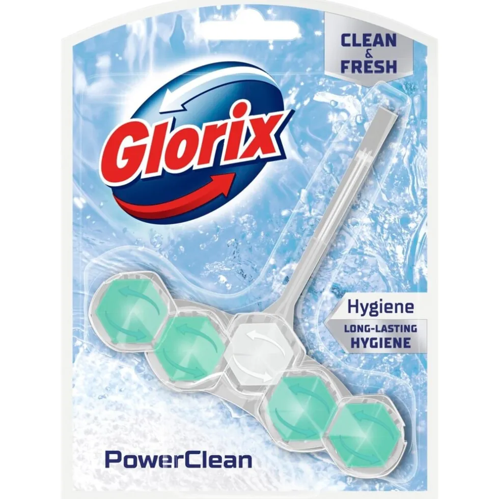 Het Glorix Hygiëne Toiletblok geeft elke spoelbeurt de kracht van Glorix Power 5, tot wel 300 spoelbeurten lang.