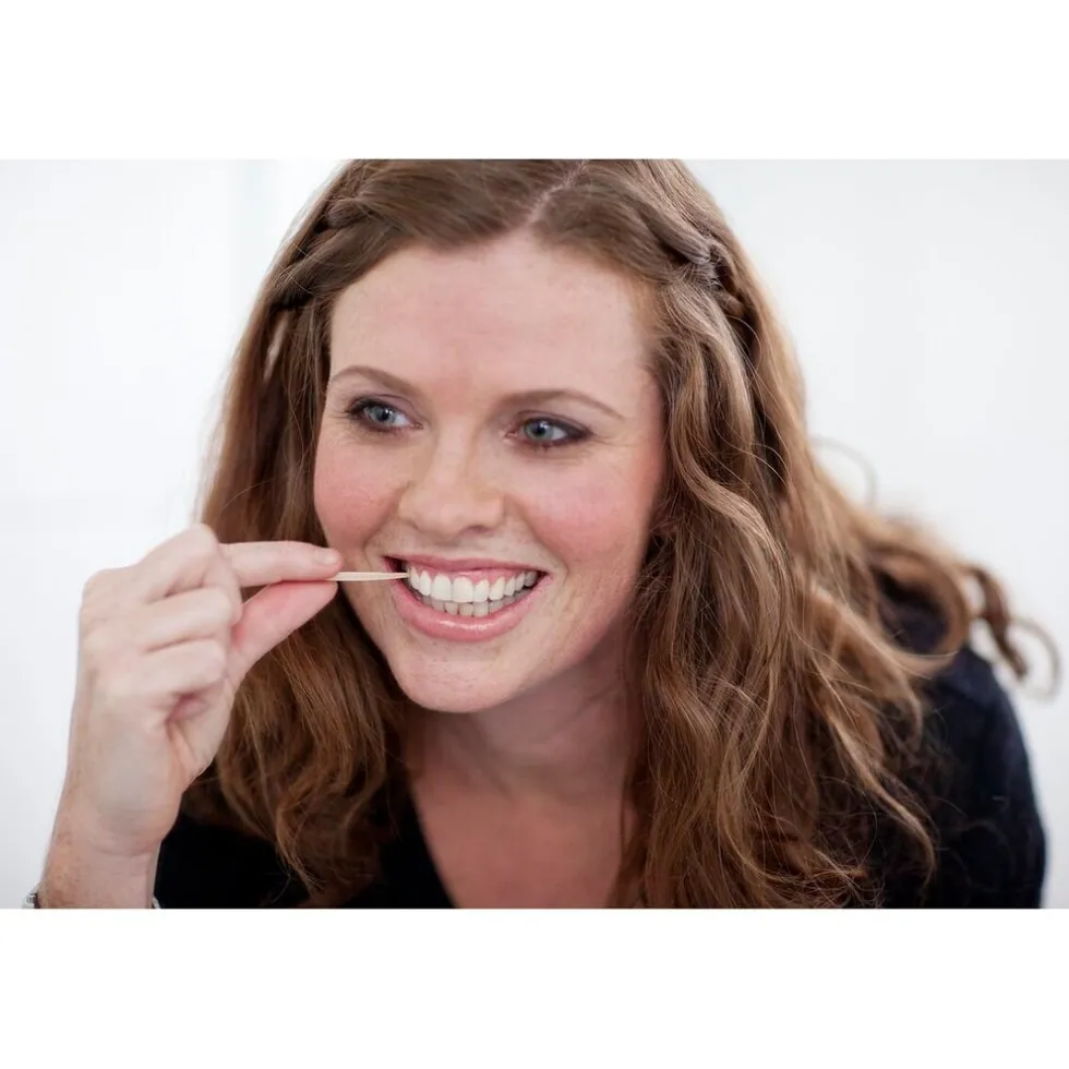 Bevochtig de tandenstoker in je mond voor je hem gebruikt zodat hij minder snel breekt. Ook past de tandenstoker zich dan beter aan de ruimte tussen je tanden aan.