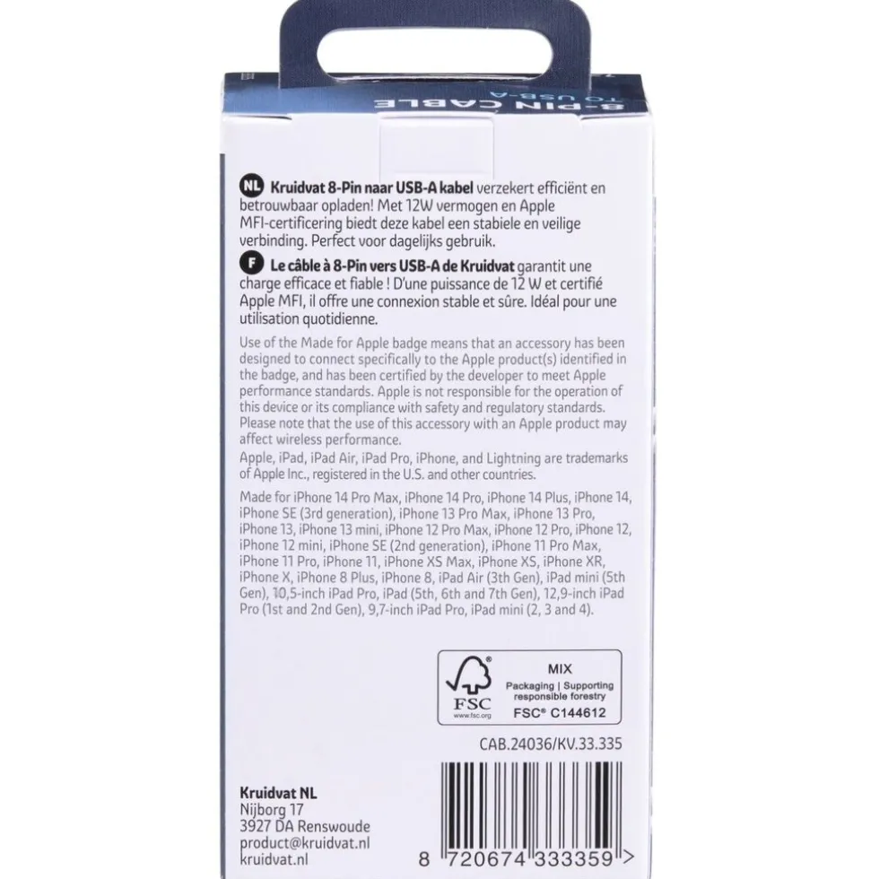 Kruidvat 8-pin Kabel 3 meter is geschikt voor het snel en veilig opladen en synchroniseren van alle apparaten met een 8-pin (Lightning) aansluiting. Deze kabel heeft een officiele Apple licentie en werkt op alle iOS versies. USB 2.0 naar 8-pin connector. Max 2.4 ampère. Lengte 3 meter.