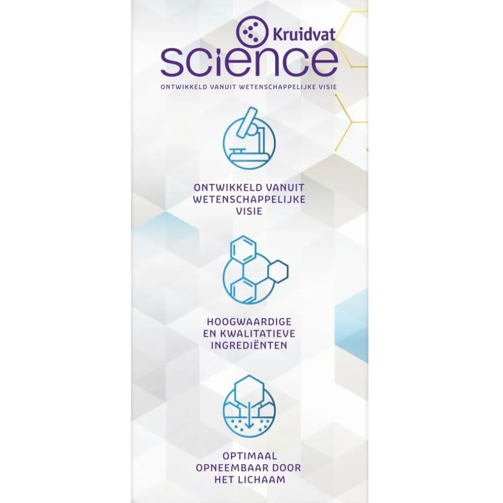 Kruidvat Science biedt kwalitatief hoogwaardige voedingssupplementen die zijn ontwikkeld door experts en bevatten ingrediënten die een wetenschappelijk bewezen werking hebben. Elk supplement bevat hoogwaardige ingrediënten (namelijk actieve of organische verbindingsvormen) die goed door het lichaam herkenbaar én optimaal opneembaar zijn.