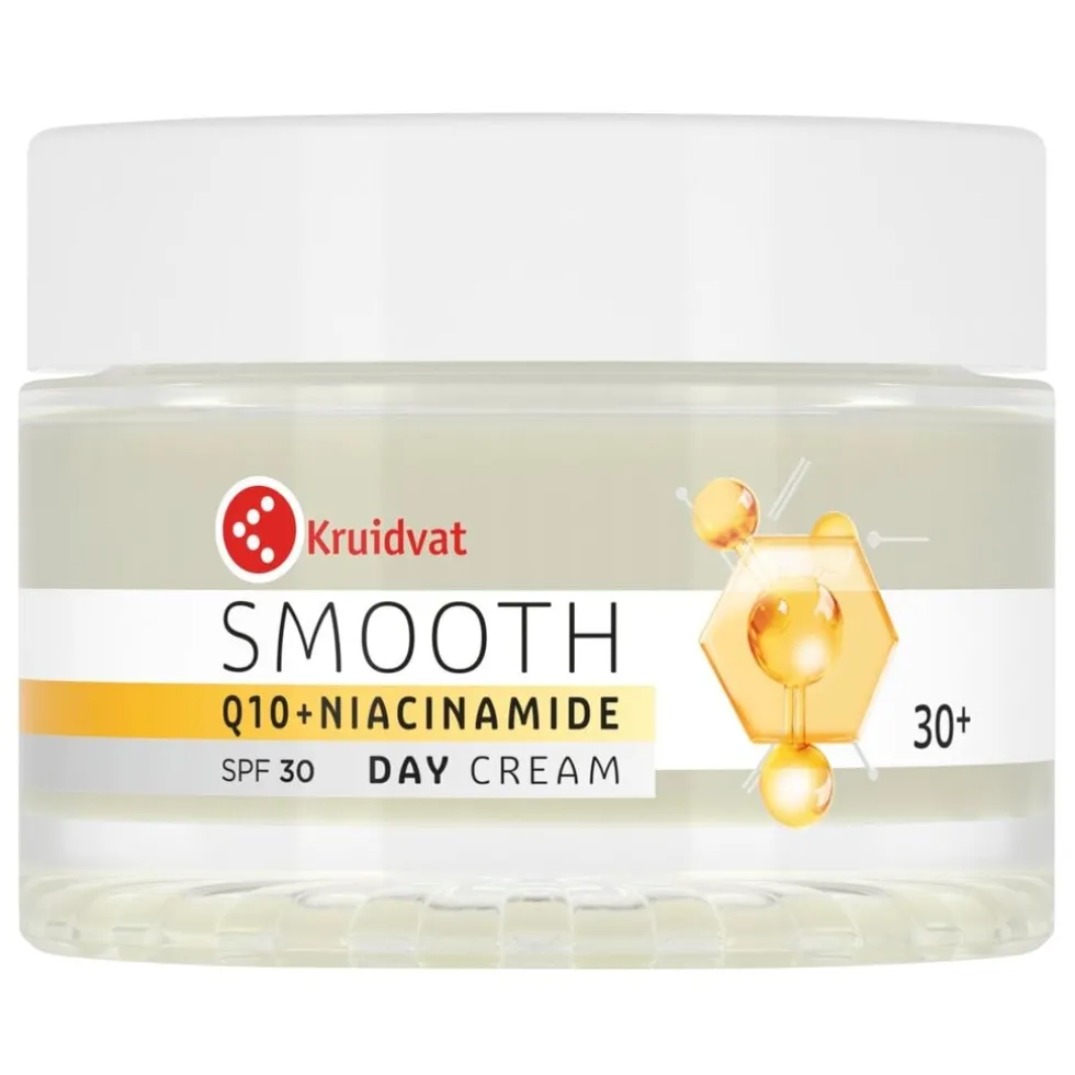 De Kruidvat Smooth Q10 + Niacinamide SPF30 Dagcrème hydrateert 24 uur lang, vermindert fijne lijntjes en rimpels en stimuleert de collageenproductie voor een stevigere huid.