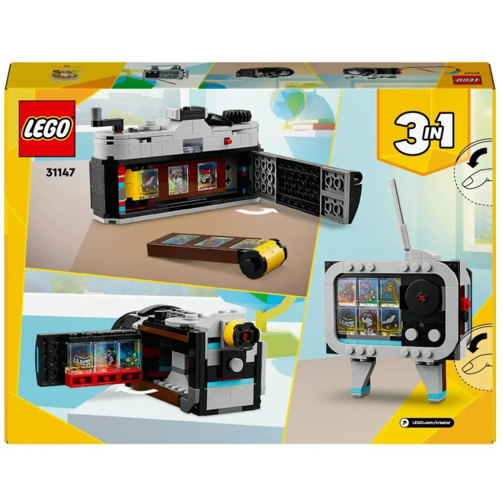 Met deze 3-in-1 LEGO Creator 31147 Retro Fotocamera krijg je drie verschillende bouw- en speelervaringen met dezelfde stenen. Bouw een fotocamera en bouw deze vervolgens om tot een retro videocamera of een retro tv met antenne. Alle drie de modellen zien er prachtig uit op een plank in je kamer. Maak je de camera? Dan zijn er zes stickers die je aan de film kan toevoegen als ‘foto’s’.