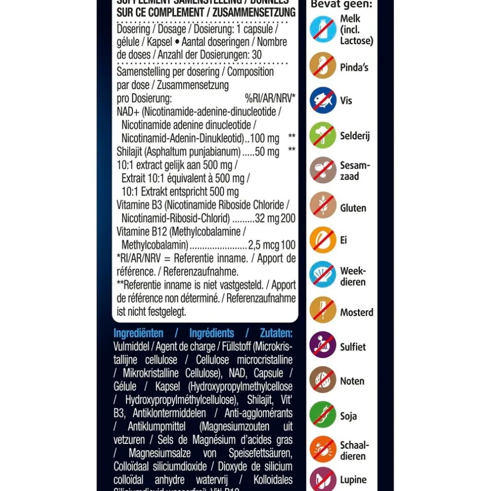 Ingrediënten: Vulmiddel (Microkristallijne cellulose), NAD, Capsule (Hydroxypropylmethylcellose), Shilajit, Vitamine B3, Antiklontermiddelen (Magnesiumzouten uit vetzuren, Colloïdaal siliciumdioxide watervrij), Vitamine B12.