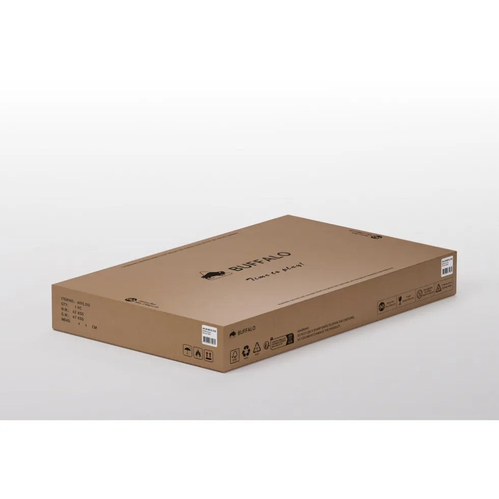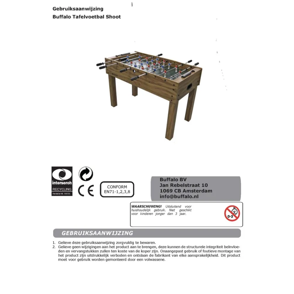 De Shoot van Buffalo is een prachtige voetbaltafel van MDF in hout look. De tafel heeft een mooie afwerking en een solide constructie. Dit resulteert in een uitstekende prijs-kwaliteit verhouding! Het formaat en de telescoopstangen maken deze tafel ideaal voor kinderen tot 12 jaar. De telescoopstangen bieden bescherming tegen eventuele bezering doordat de stangen niet uitsteken, maar in elkaar schuiven. De tafel zorgt gegarandeerd voor vele uren speelplezier, voor zowel jong als oud! Nodig familie en vrienden thuis uit en organiseer een toernooitje voor maximale spanning. Tafelvoetbal gaat erg snel en is daardoor ook een ideale training voor oog/handcoördinatie en het reactievermogen. Specificaties: