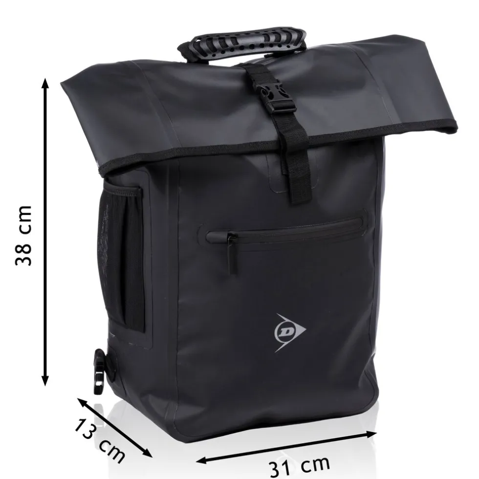 De fietsrugzak heeft een inhoud van 25 liter en is gemaakt van een waterdichte stof zodat jouw spullen ook bij slechter weer goed beschermd blijven in de Dunlop fietstas. De opening van de tas zit aan de bovenkant die je afsluit doormiddel van een rol topafdichtig, hierdoor zal er geen water in de tas lekken wanneer het regent. Je sluit de rugzak veilig af met een gespafsluiting.